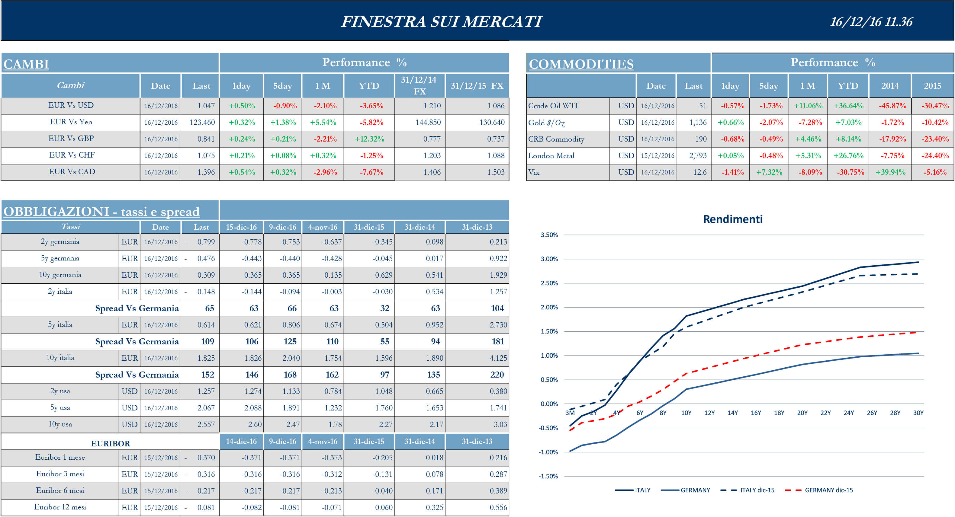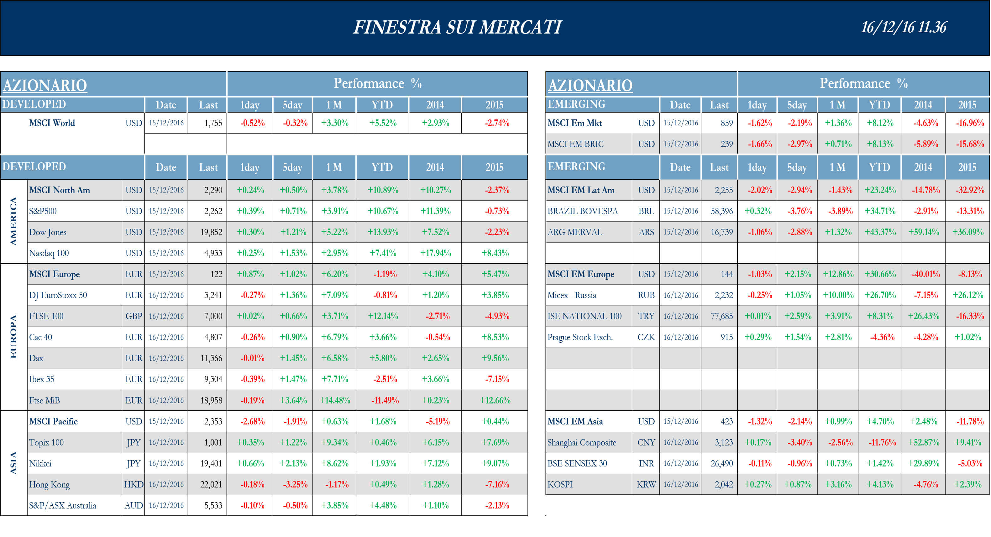 Settimana di borse europee e statunitensi positive, mentre i listini asiatici rimangono contrastati, con la Cina che chiude la settimana in negativo, sui timori di una possibile guerra commerciale con gli Stati Uniti. Negli Stati Uniti, la settimana è stata rivolta all’atteso meeting di politica monetaria: la Federal Reserve ha aumentato il corridoio obiettivo per il tasso sui federal fund di 25 punti base al 0,50-0,75%, riprendendo il processo di normalizzazione della politica monetaria che aveva iniziato esattamente un anno fa. La decisione largamente attesa sul mercato è stata presa all’unanimità. Dopo aver rimandato il rialzo per fattori esogeni più volte durante l’anno, la Fed conclude così il 2016 alzando i tassi meno di quanto originariamente programmato e meno di quanto atteso dai mercati ad inizio 2016, restando “dietro alla curva”. In base ai cosiddetti “dots”, ovvero la mediana delle proiezioni sui tassi dei membri del FOMC, per il 2017 vengono ora visti tre rialzi, uno in più di quelli indicati lo scorso settembre. I mercati hanno reagito più alla notizia di accelerazione del processo di normalizzazione della politica monetaria, che non al rialzo di un quarto di punto consegnato. Durante la conferenza stampa il Presidente Janet L. Yellen ha ripetuto che la politica monetaria resta accomodante e che il livello neutrale del tasso di interesse resta basso. Inoltre, pur definendo la variazione nelle proiezioni solo marginale, ha citato l’attesa politica fiscale pro-ciclica quale una delle ragioni per cui alcuni dei membri del FOMC hanno modificato al rialzo le loro proiezioni. In Europa, il focus politico riguarda le tempistiche dell’avvio dei negoziati sulla Brexit, che Theresa May conta di avviare entro marzo, e la riunione del Consiglio Europeo che si è aperta a Bruxelles. Con riferimento alla stessa Brexit, si è conclusa con una situazione invariata la riunione di politica monetaria della BoE, che attende di verificare l’impatto dell’avvio del processo prima di intervenire sull’attuale situazione. Sul tavolo del vertice europeo, invece, il quadro geopolitico, con l’emergenza migranti e la crisi in Ucraina: Germania e Francia sono favorevoli a un’estensione delle sanzioni contro la Russia, già prorogate diverse volte, a causa dei mancati progressi nell’accordo di Minsk per il cessate il fuoco in Ucraina orientale.