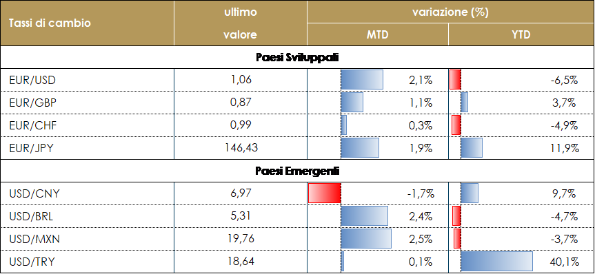 Il passo dei prossimi aumenti dei tassi sarà ridotto, mentre il terminal rate potrebbe risultare superiore alle aspettative di alcuni mesi fa e il lasso di tempo in cui la politica monetaria resterà restrittiva potrebbe essere più lungo di quanto atteso dal mercato. Nel 2023 la politica monetaria resterà restrittiva, cercando un equilibrio tra la lotta all’inflazione, che pur in rallentamento resterà vischiosa, e il rischio di instabilità finanziaria. La crescita economica influirà maggiormente nelle decisioni di politica monetaria. La principale sorpresa della settimana è stata il tono hawkish della BCE: mentre Powell ha esitato sulla questione se il prossimo rialzo sarà di 25 o 50pb, Lagarde ha affermato che sono in arrivo più rialzi di 50pb. Jerome Powell ribadisce che non taglierà il costo del denaro nel 2023 La riunione del FOMC di dicembre ha consegnato come da attese un rialzo dei tassi di 50pb, portando il fed fund rate a 4,50%. Contestualmente, il FOMC ha alzato di 50pb la proiezione del picco del fed fund rate nel 2023, portandolo al 5-5,25%. Questo movimento, ampiamente anticipato dalle parole pronunciate da J. Powell al Brooking Institute, è stato determinato da un aumento delle proiezioni sull’inflazione per il 23 e il 24 rispetto a settembre. IL OFM ha rivisto al rialzo la previsione dell’inflazione al 3,5% a fine 23 e al 2,5% e a fine 24 contro il 3,1% a fine 23 e il 2,3% a fine 24 della proiezione di settembre, nonostante i due migliori dati sull’inflazione e l’impatto dei due ulteriori rialzi. La Fed sta segnalando che rimane unanime nel suo proposito di ridurre l’inflazione e che avrà bisogno di “prove sostanzialmente maggiori” sul raffreddamento dell’inflazione prima di fermarsi. Nel valutare le prospettive dell’inflazione, J. Powell ha giustificato la proiezione di un’inflazione più elevata sulla base di un punto di partenza più alto alla fine del 2022 e dell’impatto di un mercato del lavoro più forte, più a lungo, e di salari elevati. Christine Lagarde ribadisce che il pivot di politica monetaria è lontano nell’Area Euro La BCE ha aumentato di 50pb i tre tassi di interesse di riferimento (2,50%, per le operazioni di rifinanziamento principali, 2,75% per quelle marginali e 2% sui depositi presso la banca centrale) e rivisto significativamente al rialzo le proprie proiezioni sull’inflazione, che raggiungerà l’8,4% nel 2022, per poi scendere al 6,3% nel 2023. L’inflazione dovrebbe poi raggiungere una media del 3,4% nel 2024 e del 2,3% nel 2025. Pertanto, la BCE prevede un’inflazione superiore al target del 2% per tutto l’orizzonte previsivo. L’inflazione core al netto dell’energia e dei generi alimentari dovrebbe essere in media del 3,9% nel 2022 e salire al 4,2% nel 2023, prima di scendere al 2,8% nel 2024 e al 2,4% nel 2025. Relativamente alle previsioni di crescita, la BCE ha ridotto la sua valutazione sulla crescita del PIL nel breve periodo, ma ha mantenuto una visione molto positiva per il lungo periodo. L’economia dell’Area Euro potrebbe subire una contrazione nel trimestre in corso e in quello successivo, a causa della crisi energetica, dell’elevata incertezza, dell’indebolimento dell’attività economica mondiale e dell’inasprimento delle condizioni di finanziamento. Secondo le ultime proiezioni dello staff dell’Eurosistema, una recessione sarebbe relativamente breve e poco profonda. La crescita dovrebbe comunque essere contenuta l’anno prossimo: le proiezioni dello staff dell’Eurosistema prevedono ora una crescita dell’economia del 3,4% nel 2022, dello 0,5% nel 2023, dell’1,9% nel 2024 e dell’1,8% nel 2025. Ciò che ha sorpreso maggiormente il mercato è stato il tono particolarmente hawkish della conferenza stampa: l’annuncio che i tassi saranno alzati ancora in misura non marginale è stato ripetuto più volte sia nello statement e sia nella conferenza stampa ed è stato rafforzato dalla revisione delle previsioni. Nella conferenza stampa, inoltre, Lagarde ha rimarcato che il Consiglio Direttivo ritiene che non basterà portare i tassi per breve tempo in territorio restrittivo, ma che dovranno restarci per un po’ di tempo. Il passo sostenuto dovrebbe essere coerente con almeno un’altra mossa di 50 pb, almeno nella riunione di febbraio. Di conseguenza, il mercato ha rivisto al rialzo i tassi terminali della BCE di 20 pb, portandoli al 3,18%. La BCE ha inoltre annunciato che inizierà il tapering della APP a marzo 2023, con una riduzione dei reinvestimenti di 15 miliardi di euro al mese in media fino a giugno 2023. Potrebbe poi accelerarne il ritmo, portando il calo dei reinvestimenti al 75%, fino a non effettuare alcun reinvestimento nel 2024. Il tono particolarmente hawkish della BCE si è tradotto in un ampio movimento del mercato: i rendimenti a 2 anni sono aumentati di 25 bp, gli spread BTP-Bund sono più ampi di 10 bp. Il movimento più pronunciato, tuttavia, è stata la sottoperformance dei Bund rispetto agli UST, con spread a 10 anni più stretti di 30 bp nella settimana. Anche la Swiss Bank continuerà ad aumentare il costo del denaro La Banca Nazionale Svizzera ha aumentato per la terza volta nel 2022 il tasso di interesse di riferimento di 50 pb, portandolo all’1%. L’aumento, che giunge in concomitanza con l’inasprimento della politica di altre banche centrali, ha portato i tassi di interesse svizzeri al livello più alto dalla crisi finanziaria globale di 14 anni fa. “Non si può escludere che ulteriori aumenti del tasso di riferimento della BNS siano necessari per assicurare la stabilità dei prezzi nel medio termine”, ha dichiarato l’istituto centrale in un comunicato Bank of England (BoE) sembra più vicina al pivot La BoE ha alzato i tassi al 3,50% (dal precedente 3,00% di novembre), con un voto molto frammentato del suo Board: sei membri a favore di +50 pb, due a favore di tassi immutati e uno a favore di +75 pb. Questa divisione all’interno d