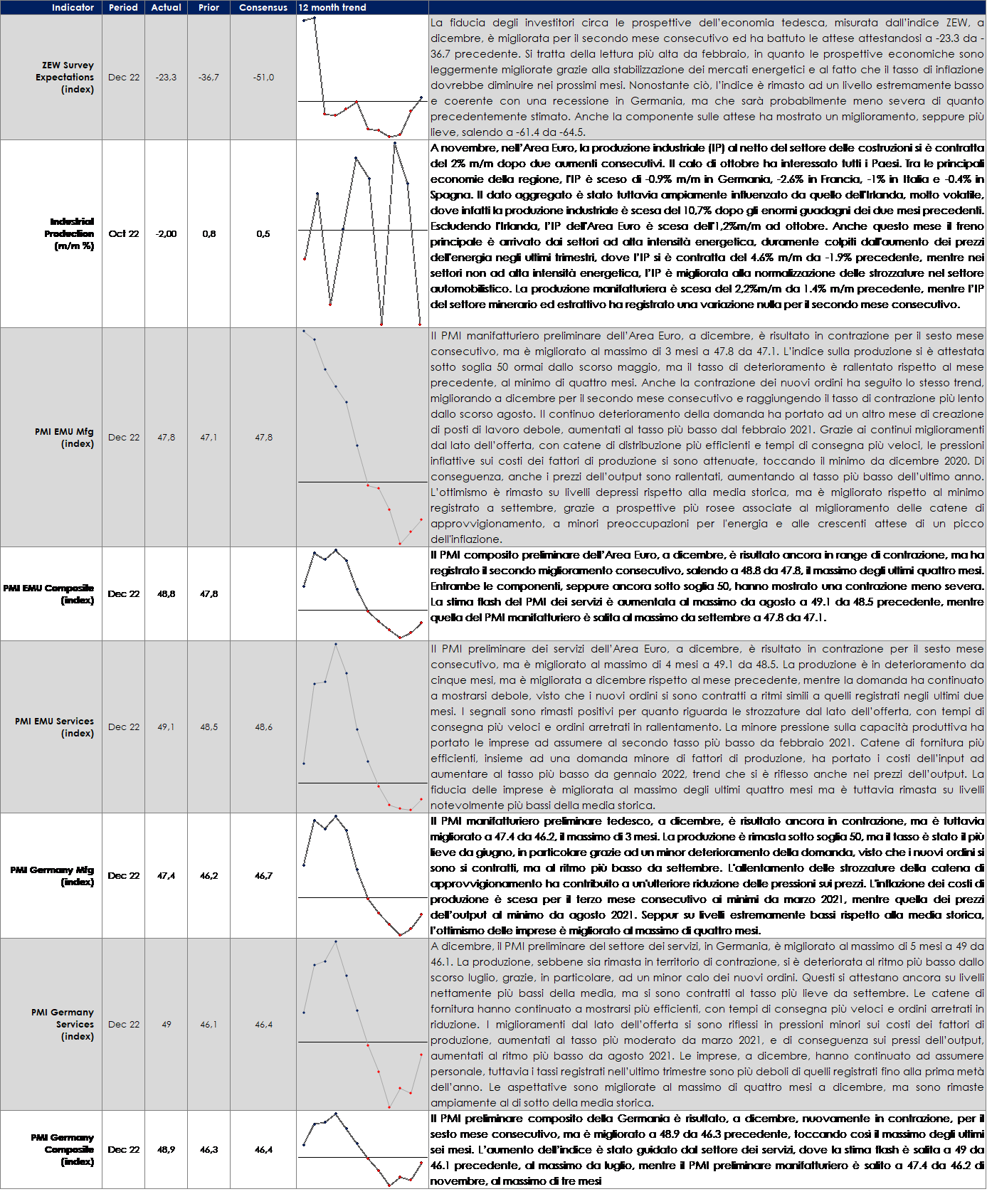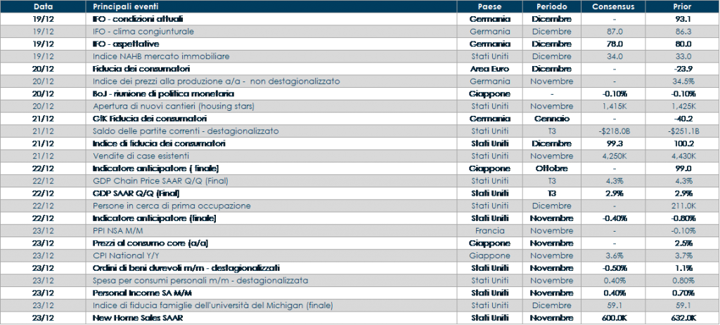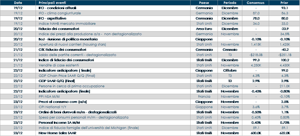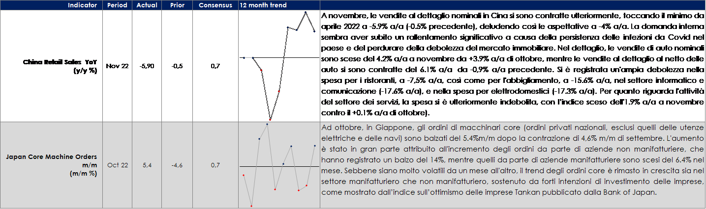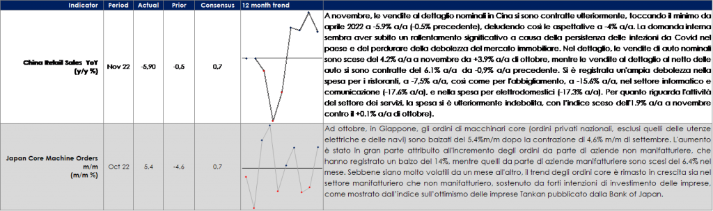 - Asia: il Giappone vedrà la pubblicazione dell’inflazione di novembre, degli ordini di macchine utensili e del Leading Index.