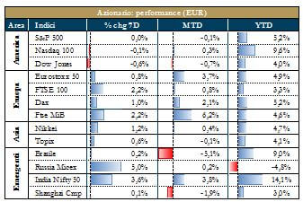 Europa: nel settore finanziario e assicurativo, il colosso Munich RE ha rilasciato risultati 2016 allineati alle stime degli analisti con un calo del 17% dell’utile netto a €2.58 miliardi e una flessione dell’EBIT a €4.025 mld (da 4.819 mld del 2015). Il CDA propone un dividendo di €8.6 per azione e annuncia un buy back fino ad un €1 miliardo nel 2018. Per il 2017 il gruppo assicurativo tedesco prevede un utile netto tra €2 e €2.4 miliardi. Sempre nelle assicurazioni, Generali dichiara di non sentirsi minacciata da possibili scalate e di guardare con fiducia al futuro come gruppo indipendente, italiano e con vocazione internazionale; la società ha presentato conti 2016 che vedono un utile operativo record, il miglior utile netto e il più generoso dividendo degli ultimi nove anni. Passando alle banche, Credite Agricole, a monte dell’aumento di capitale da €1.5mld, lancerà un’offerta sul 6.6% della proprio bond subordinato. Sulla stessa strada Banco BPM che ha annunciato di voler promuovere un’offerta di riacquisto del prestito obbligazionario subordinato lower tier II al 2020, del valore nominale €640mln. I due istituti sono legati anche nella vicenda Agos, società di credito al consumo posseduta al 61% da Credit Agricole e al 39% da Banco Bpm, dove tutti gli scenari sono aperti e il gruppo francese sarebbe pronto a discutere con il partner italiano sul futuro della società. Nel frattempo, Poste Italiane ha chiuso il 2016 con un utile netto di €662 milioni rispetto ai €552 di fine 2015, un risultato operativo di 1.04 miliardi (+18.3%) e ricavi saliti a €33.1 miliardi (+7.7%). I risultati, insieme alla proposta di un dividendo a €0.39 per azione, sono superiori alle attese degli analisti; l’istituto potrebbe vivere un cambio di governance poiché la conferma dell’AD Caio sarebbe in forse, scrive La Repubblica, secondo cui il manager non avrebbe più il favore della maggioranza Pd guidata da Matteo Renzi, insoddisfatta per alcune mancate operazioni di ‘sistema’, come quella per l’acquisto di Pioneer da UniCredit. Segnali positivi proprio da Piazza Cordusio con il Ceo Jean Pierre Mustier che ha acquistato azioni della banca per un controvalore di €2mln, come annunciato in occasione della presentazione del piano strategico il 13 dicembre. La banca prevede un cambio della governance con la presenza internazionale e di indipendenti nel cda che sarà in maggioranza: almeno 8-9 membri saranno espressi dai grandi investitori e alle quote rosa andrà il 30%. Pertanto oltre F. Palenzona, anche V. Calandra Buonaura dovrebbe portare a termine il prossimo anno la sua lunga esperienza. Indicazioni positive da Banca Ifis il cui piano 2017-19 vede un tasso annuo di crescita dell’utile netto del 40-45%, un ROE nel 2019 superiore al 15% ed EPSe Book Value proiettati rispettivamente oltre €4.5 e €30. Infine, nel risparmio gestito, Azimut ha siglato un accordo per rilevare l’80% di New Horizon Capital Management Ltd, una boutique di asset management basata presso il Dubai International Financial Center.Nel settore auto Volkswagen si dichiara colpevole davanti alla giustizia americana di frode e ostruzione alla giustizia nello scandalo del dieselgate. Un’ammissione davanti al tribunale di Detroit che rientra nell’accordo raggiunto in gennaio, nell’ambito del quale Volkswagen si impegna a pagare $4.3mld in sanzioni civili e penali. Il CEO del gruppo tedesco lascia la porta aperta a possibili colloqui per una fusione con FCA, dopo i dati che evidenziano un calo dell’utile operativo del suo marchio principale, ma Sergio Marchionne ha detto che ha “zero interesse a perseguire” colloqui per una fusione con Volkswagen. Il gruppo torinese ha anche ceduto sul mercato una partecipazione residua in Cnh Industrial, pari all’1.17%, per un totale di €144,3mln. Nel lusso, Ferragamo chiude il 2016 con un Ebitda stabile a €324mln e un utile netto in aumento del 17% a €202mln grazie anche ai benefici legati al Patent Box. Sarà proposto un dividendo di €0.46 per azione, in linea con quello dell’anno precedente. Tod’s, invece, ha chiuso il 2016 con un EBITDA in calo dell’11% circa a €180.9mln, con un margine sulle vendite del 18%, e con un utile netto di €86.3mln da €93mln nel 2015. La società proporrà un dividendo di €1.70 dai €2 per azione distribuiti l’anno scorso. Nel settore Energy l’AD di Eni Claudio Descalzi ha detto che la società non è interessata a grandi acquisizioni, le dimensioni attuali vanno bene. Ha aggiunto inoltre che ha ricevuto manifestazioni di interesse per giacimenti in Congo, Ghana, Angola, ma non sta ancora parlando attivamente con nessuno. Al momento non c’è assolutamente nessuna idea di vendere la controllata chimica Versalis, secondo Descalzi. Tra le Utilities, Acea: archivia il 2016 con un utile netto in crescita del 49.9% su anno, a €262.3mln, e un dividendo proposto di €0.62, con un aumento del 24%. L’azienda ha registrato, inoltre, un Ebitda a €896.3mln (+22.4% su 2015) e ne stima per l’anno in corso un aumento tra il 4% e il 6% rispetto a quello 2016 (€785mln). Tra gli Industriali, Leonardo, vedrebbe Alessandro Profumo è in pole position per sostituire Mauro Moretti alla guida del gruppo. Ima, infine, : ha chiuso il 2016 con ricavi pari a €1.31mld, in aumento rispetto ai €1.11mld nel 2015. L’utile dell’esercizio ha raggiunto i €101.4mln, +30.3% rispetto al 2015, e l’utile del Gruppo è salito a €93.5mln, in crescita del 33.8% rispetto al 2015. Il CdA ha deliberato di distribuire un dividendo di €1.60 per azione, in crescita da €1.40 distribuito sull’esercizio precedente.