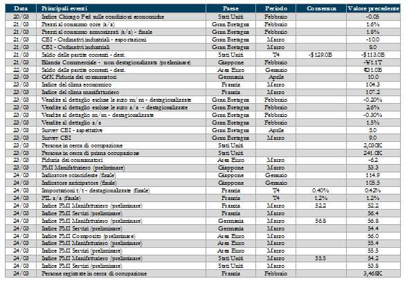 - Area Euro: nuove indicazioni dalle indagini di fiducia per il mese di marzo. La Francia sarà oggetto di interesse in chiusura di settimana con dati relativi al PIL, al PMI e alla fiducia dei consumatori. La Germania pubblicherà gli indicatori PMI e l’indice Gfk sulla fiducia dei consumatori.
