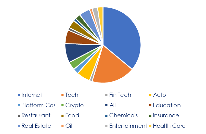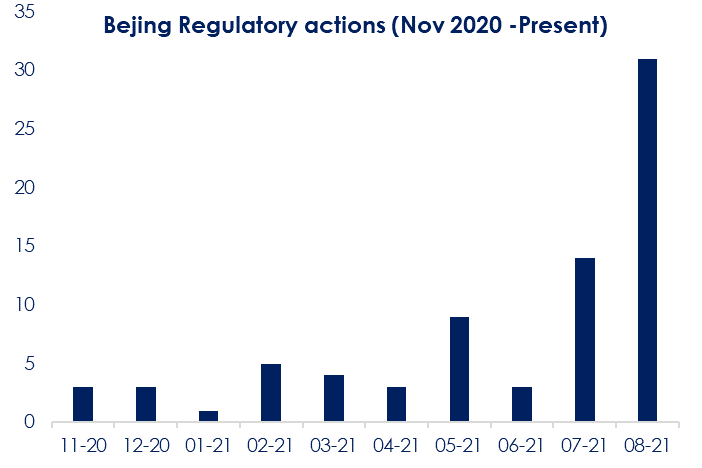| Fig.1: Pechino ha intensificato le azioni normative tra agosto e settembre (fonte dati: Cornestone) | Fig.2: in termini settoriali, le azioni normative hanno riguardato le piattaforme internet (fonte dati: Cornestone) |