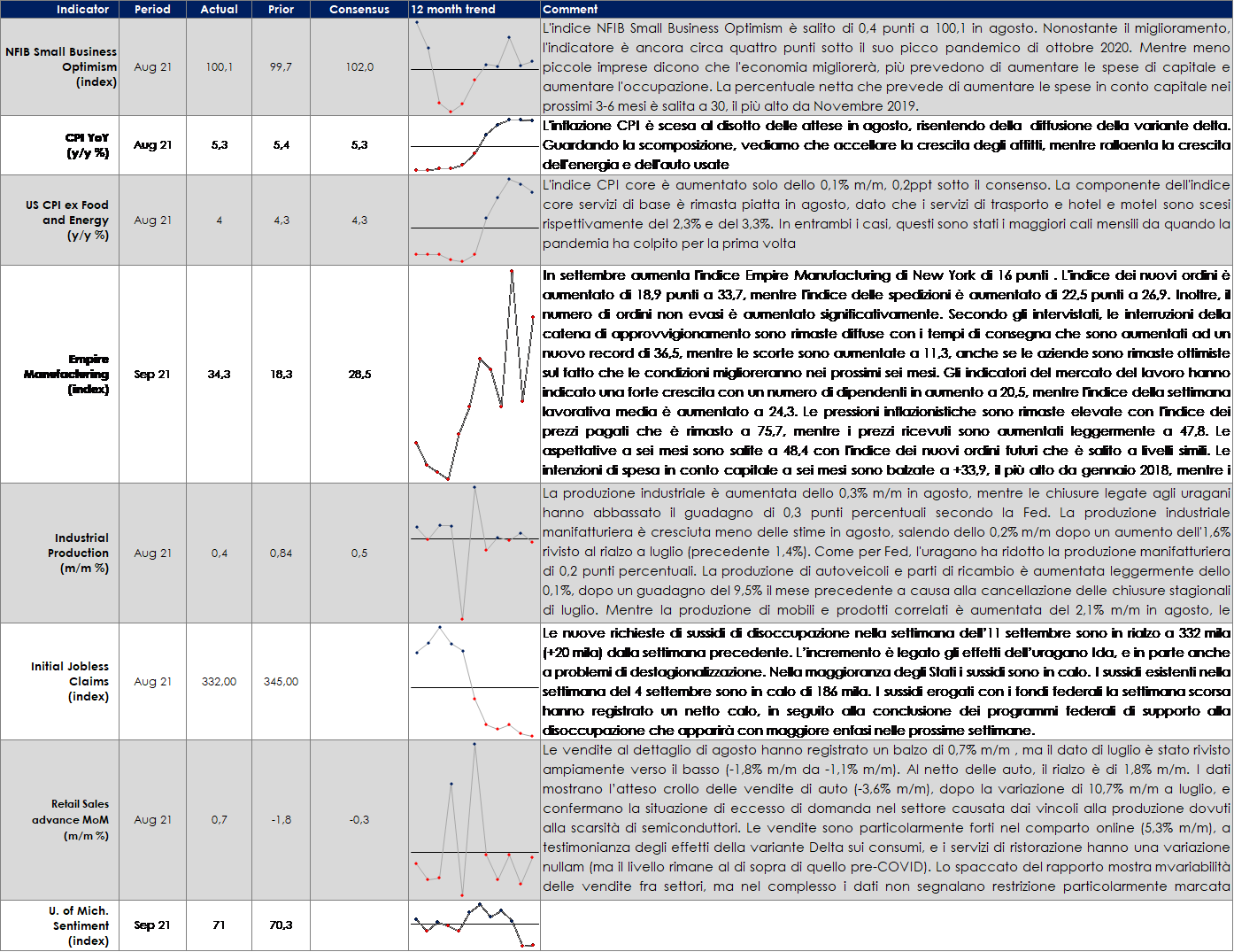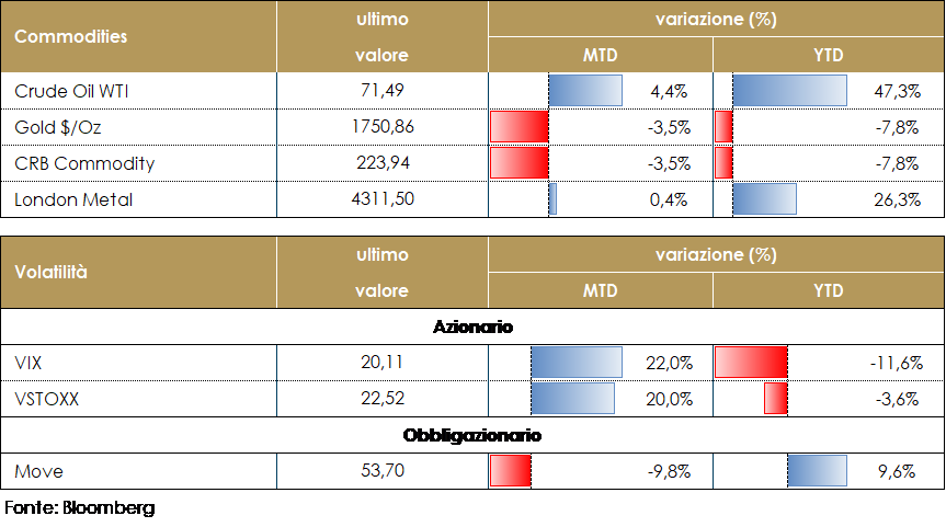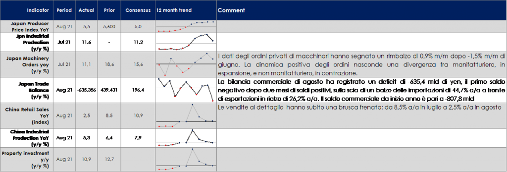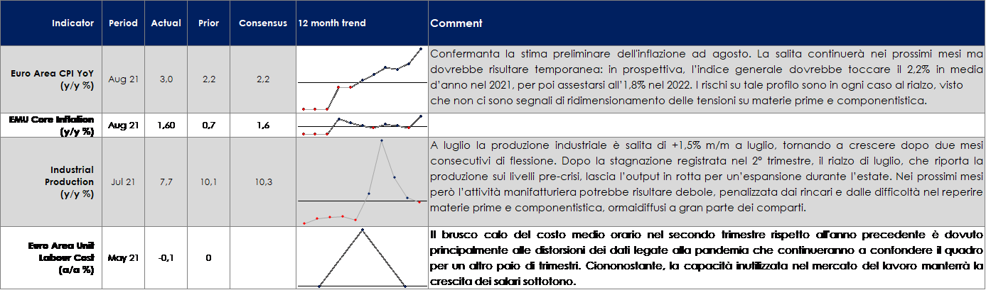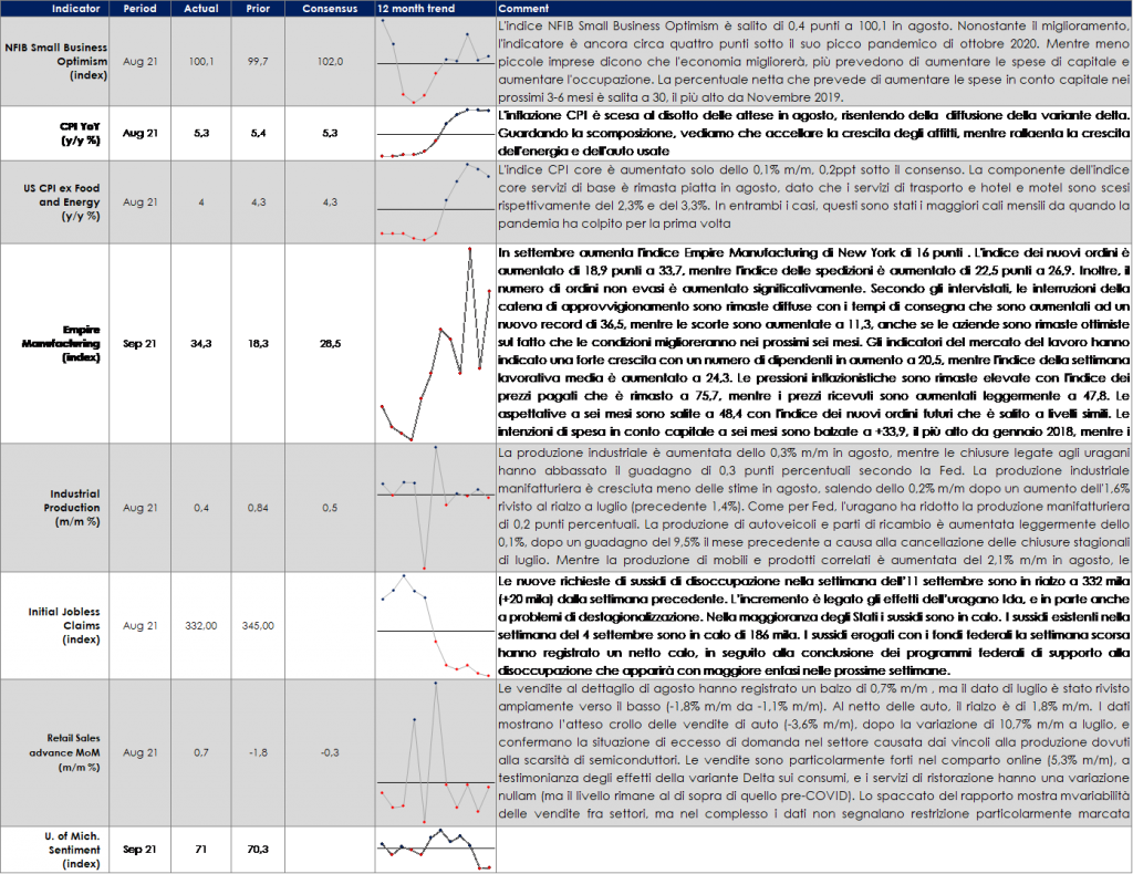 - Europa: la settimana prossima saranno pubblicati gli indici PMI preliminari sia manifatturieri che dei servizi e forniranno un importante aggiornamento sull’impatto dell’ondata di infezioni del Delta sull’attività economica. Saranno pubblicate anche altre survey a livello dei singoli paesi, l’indice IFO in Germania e la BNB in Belgio, che offriranno un po’ di colore sulle prospettive dell’attività commerciale e dei profitti europei.
