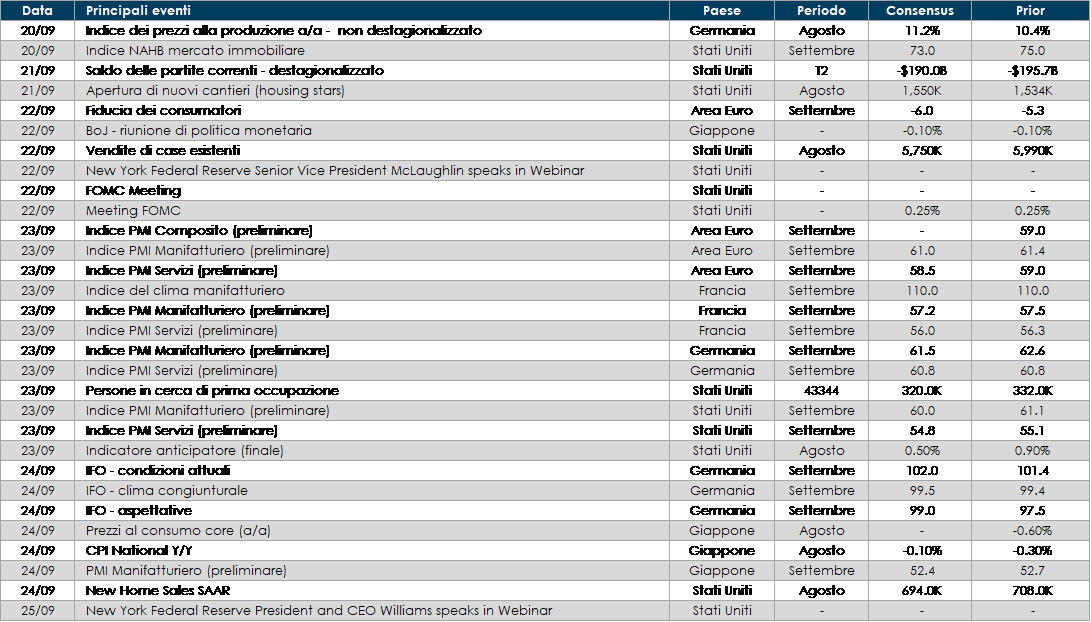 - Stati Uniti: L’attenzione dei mercati è rivolta alla riunione del FOMC di mercoledì. Inoltre, gli indici preliminari PMI saranno pubblicati anche negli Stati Uniti. Inoltre, saranno resti noti i dati sul mercato immobiliare (Il sondaggio NAHB per settembre, Housing Starts e New Home Sales per agosto)