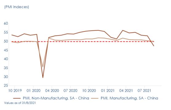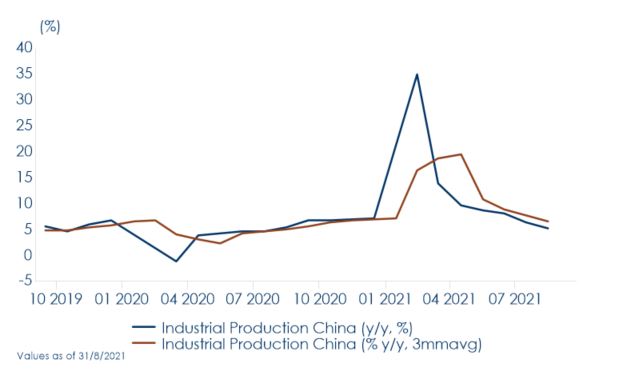 Tuttavia, i dati congiunturali mostrano una debolezza di breve periodo come riflesso di una combinazione di fattori (recenti misure di irrigidimento normativo, evoluzione dei contagi). Ad agosto i principali indicatori economici hanno continuato ad indebolirsi, deludendo le aspettative (Figg 3-4-5). La produzione industriale è aumentata del 5,3% a/a, contro il 6,4% su base annua di luglio. La produzione di elettricità, automobilistica e di metalli ferrosi hanno mostrato un significativo rallentamento della crescita su base annua, sebbene la produzione farmaceutica abbia accelerato. La crescita delle vendite al dettaglio è decelerata bruscamente al 2,5% a/a. Gli investimenti in attività fisse sono stati abbastanza in linea con le aspettative – sia la crescita degli investimenti manifatturieri e immobiliari è rallentata, mentre il calo degli investimenti in infrastrutture si è ridotto. L’atteso recupero del settore dei servizi e dei consumi rischia di non concretizzarsi neanche a settembre, o di essere molto contenuto, a causa delle misure di contenimento dei focolai di Covid-19 sorti nei giorni scorsi in alcune città della provincia del Fujian. Queste misure potrebbero infatti far deragliare la ripresa dei servizi, proprio durante le festività del Festival di metà Autunno (19-21 settembre) e quelle per la giornata nazionale (proclamazione della Repubblica Popolare il primo ottobre 1949) che si protraggono per una settimana (1-7 ottobre), nonché avere un impatto negativo sugli approvvigionamenti visto che la provincia è un grosso snodo commerciale.