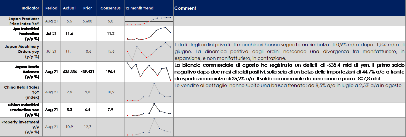 - Asia: in Giappone sarà pubblicato l’indice dei prezzi al consumo relativo al emse di agosto e l’indice PMi manifatturiero preliminare relativo al mese di settembre.