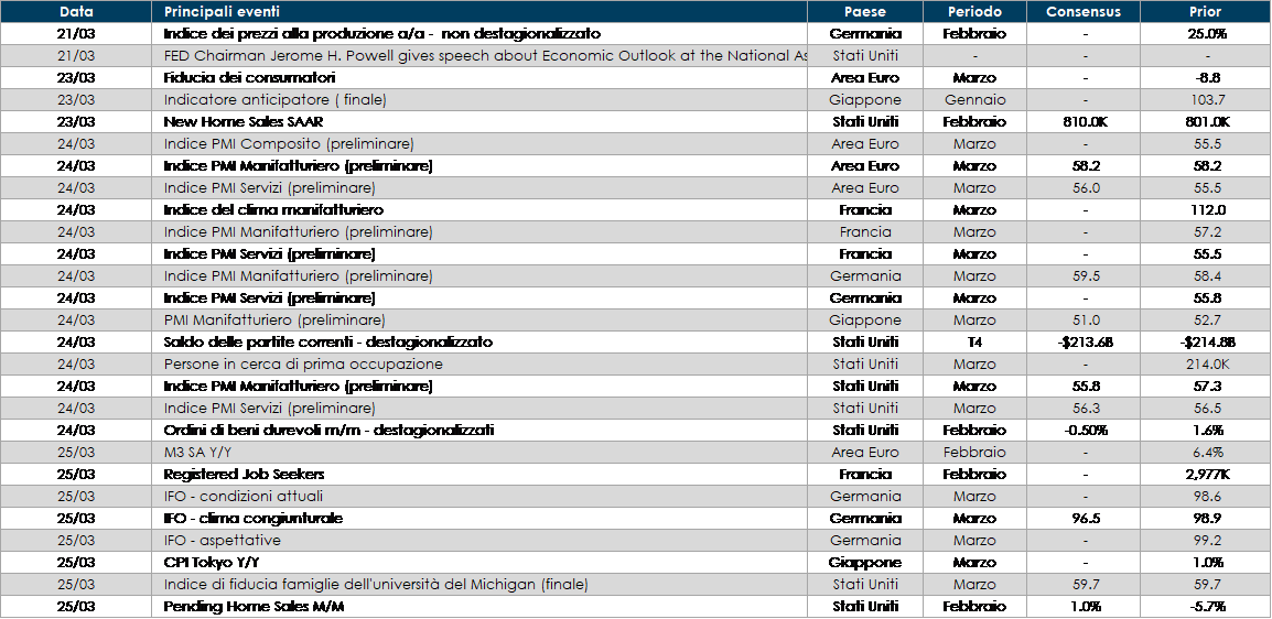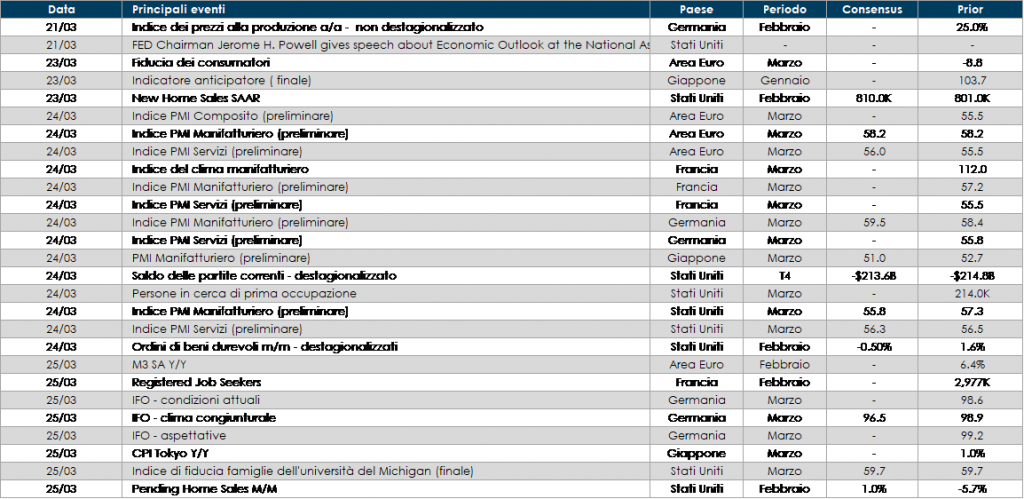 - Europa: la settimana prossima saranno pubblicate le stime preliminare degli indici PMI di marzo. I dati saranno cruciali per stabilire l’impatto della crisi ucraina sulla fiducia delle imprese. In Germania sarà pubblicato anche l’indice IFO relativo al mese di marzo.
