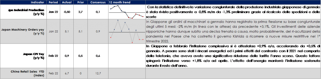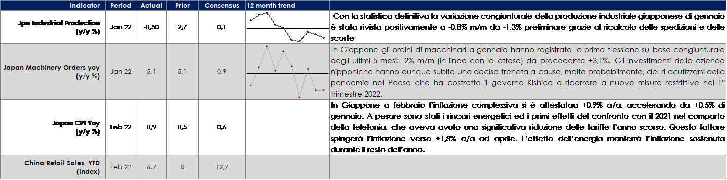 La settimana ha visto un aumento dei rendimenti obbligazionari dei principali paesi, guidati dall’aumento della componente reale, ed è stata dominata dal comportamento delle banche centrali. La Fed ha sorpreso sul lato hawkish, la BoE dal lato dovish, e la BCE ha rivelato le divisioni interne al consiglio direttivo durante la conferenza degli ECB watchers. In particolare, Schnabel e Knot hanno segnalato la loro posizione hawkish mentre Lane si aminite una posizione più dovish, ma la direzione del viaggio rimane chiara – la BCE sembra intenzionata a iniziare la normalizzazione della politica. La Banca d’Inghilterra (BoE) ha deciso di alzare ancora i tassi allo 0,75% dal precedente 0,50% di febbraio, col voto di 8-1, portando così il bank rate al livello pre-pandemia. Nessuna novità invece sul programma di acquisto di titoli, già modificato nella scorsa riunione: target di acquisto a 875 miliardi di sterline per i Gilt, ma senza più re-investimento dei titoli in scadenza; azzerata la quota di corporate bond (in precedenza di 20 miliardi); termine del programma di acquisti fissato a fine del 2023.