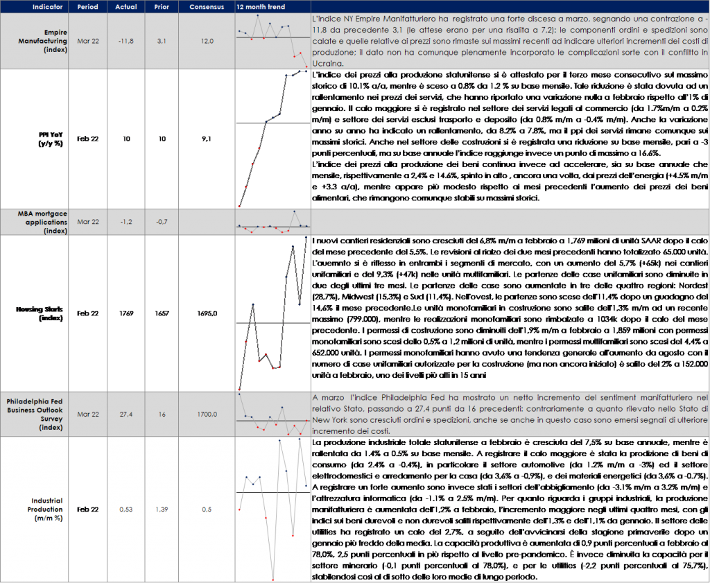 - Nella riunione di marzo il FOMC ha aumentato il costo del denaro per la prima volta in questo ciclo, segnalando per il prossimo futuro un percorso di politica monetaria un po’ più aggressivo