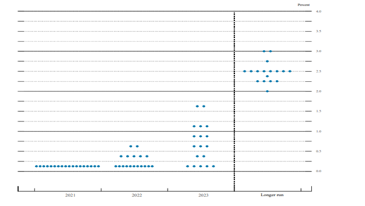 Durante il meeting di giugno il FOMC ha mantenuto invariato la sua stance di politica monetaria, pur riservando due importanti novità: una significativa revisione delle previsioni dei membri del FOMC sull’andamento del fed fund rate, dot plots (Fig. 1), e una revisione al rialzo delle previsioni di inflazione (e crescita) per il 2021, per tener conto dell’accelerazione congiunturale in atto (Fig.2) e. Sono, invece, rimasti fermi i tassi di interesse allo 0-0,25% e sono stati confermati gli acquisti di titoli (80 miliardi di dollari al mese di bond, più 40 miliardi di asset backed securities) e più in generale l’orientamento di politica monetaria.