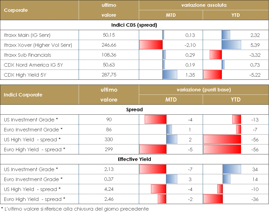 MERCATI DEI TITOLI CORPORATE La settimana sul mercato del credito, così come per i principali asset rischiosi, è stata piuttosto negativa soprattutto nella seconda parte della settimana. A pesare sul mercato soprattutto il tono meno accomodante della Fed americana che pur mantenendo sostanzialmente invariate le politiche monetarie (tassi e acquisti dei programmi di QE) e gli obiettivi (financial stability e participation rate nel mercato del lavoro su tutti) ha lanciato alcuni segnali di rinnovato ottimismo per la crescita. Gli indici CDS hanno chiuso in allargamento la settimana: Main (IG) +1, e Xover (HY) +7bps in europa mentre in US +2 IG e +11 HY. Negli indici cash lievemente migliore la performance con total return lievemente negativi tranne IG Corporate US che beneficia del flattening della curva US. Sul mercato primario la settimana è stata nuovamente molto intensa in particolare nella prima parte e flussi ancora positivi per tutti i comparti del credito. Su Corporate IG senior nuove emissioni per Stellantis (due tranche 7.5y 0.75% e 1.25% 12y), Colonial (0.75% 8y), Terna (0.375% 8y), Teollisunden (1.375% 7y), Ascendas (0.75% 7y). Molto attivo anche il comparto dei subordinati corporate, con Poste Italiane (2.375% perp nc8y), Heimstaden Bostad (3% perp nc6y) e SBB (2.875% perp nc5y). Su finanziari multitranche per Mutuelle Assurance (3.5% perp nc 7.5%, 2.125% t2 31y nc11y e senr 0.625% 6y), Commerz (4.25% AT1 Perp nc6y), Bankinter (1.25% T2 11nc6y), Bank of Cyprus (Senr 2.5% 5y) e Santander (Snp 0.625% 6y). Infine ancora tante nuove emissioni e rifinanziamenti su HY tra cui NH Hotel (4% 5y), Antolin (3.5% 7y), Link Mobility (3.375% 4.5y), Noman Foods (2.5% 7y), GTC Aurora (2.25% 5y). A cura del team obbligazionario di Mediobanca SGR PERFORMANCE DEI TITOLI CORPORATE – Dati aggiornati alle 17.30 Corporate IG: Il supporto della politica monetaria con acquisti diretti e forward guidance su “tassi bassi a lungo” giustificano i livelli compressi degli spread. Nel corso dell’anno il miglioramento del ciclo economico garantirà ulteriore supporto alla solidità dei fondamentali. Manteniamo una view neutrale. Corporate HY: Outlook positivo ma con possibili fasi di volatilità che potranno rappresentare occasioni di acquisto. Default rate contenuti con picco nel T1, su livelli comunque ridotti rispetto ai cicli precedenti. Supporto al mercato da fattori tecnici positivi e ricerca di rendimento. Manteniamo una view neutrale.