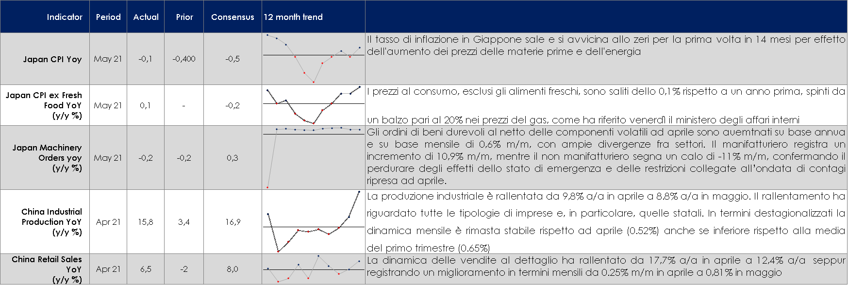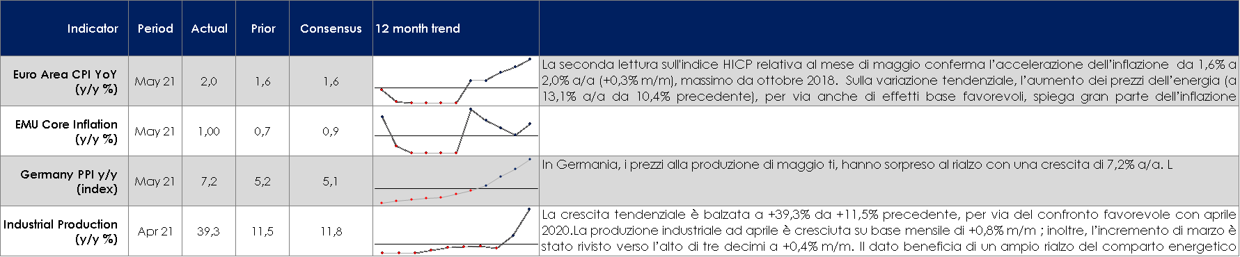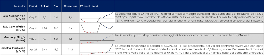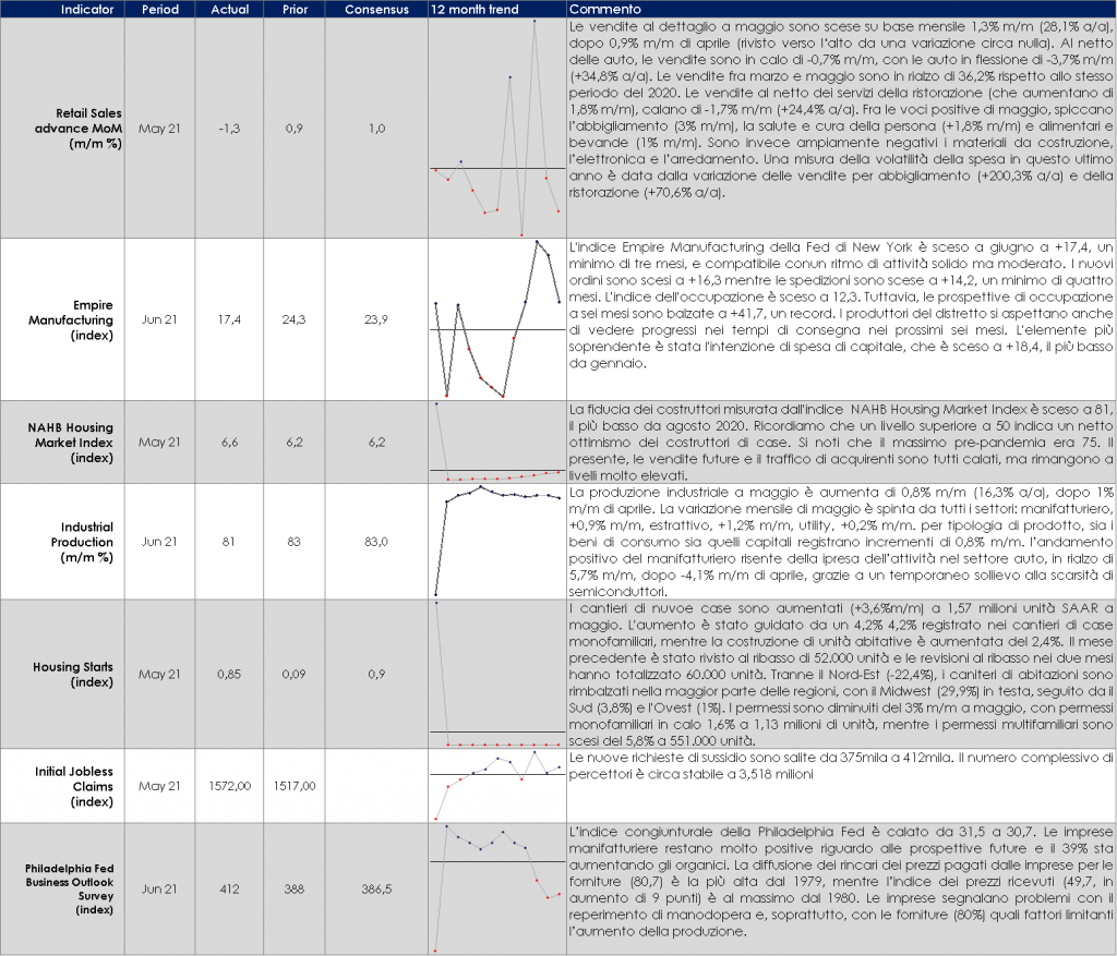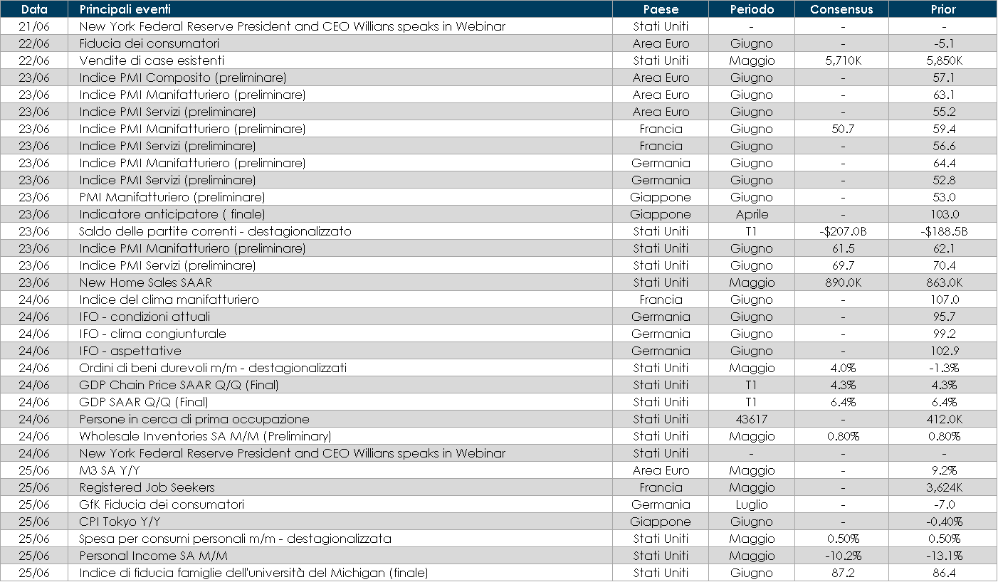 - Stati Uniti: saranno pubblicati i valori preliminari degli indici PMI di giugno, ma cosa più importate sarà pubblicato l’indice PCE relativo al mese di maggio. Non solo i mercati esamineranno attentamente la variazione mensile al fine di valutare se possa essere classificata come temporanea, ma la reazione a un valore positivo rischia di essere molto più pronunciata che in passato. Un argomento simile si applica alla stima finale delle aspettative d’inflazione U. Michigan. Il presidente Powell potrebbe cercare nella sua testimonianza al Congresso la prossima settimana di minimizzare ancora il dots plot pubblicato questa settimana.