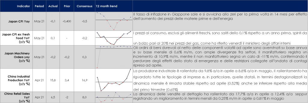 ASIA: in Cina i dati di maggio sono stati in generale inferiori alle attese evidenziando un rallentamento dell’attività