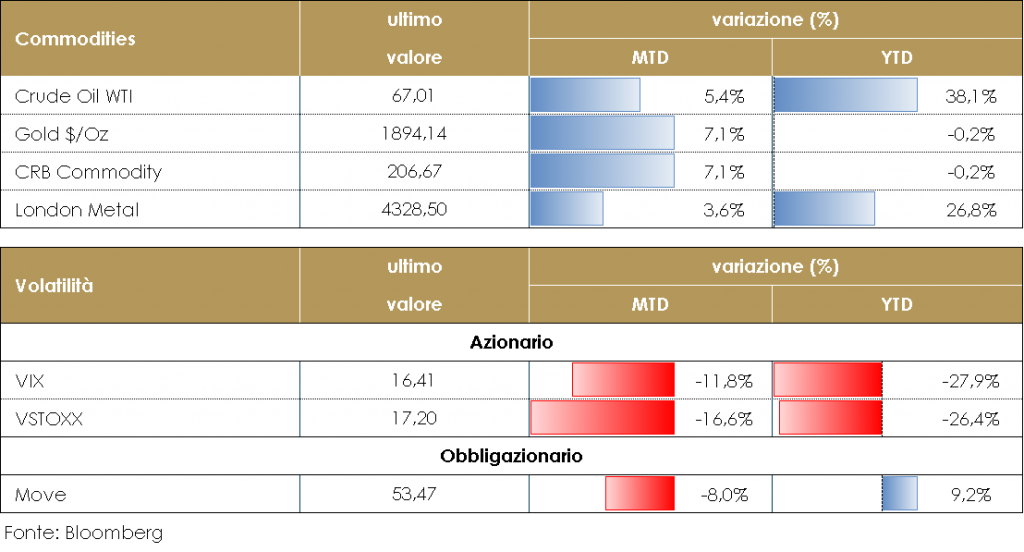 PERFORMANCE DEI TITOLI DI STATOIl mercato dei titoli governativi ha chiaramente risentito del meeting del FOMC. Mercoledì, l’interna struttura a termine statunitense ha visto aumentare i propri rendimenti subito dopo la pubblicazione dello statement del FOMC. Il rendimento del decennale, salito fino a 1.57%, nei giorni successivi ha invertito il suo rimbalzo post-riunione per stabilizzarsi appena sopra l’1,50%, in definitiva poco variato rispetto a prima della riunione della BCE della scorsa settimana. Il rendimento a 5 anni rimane stabile vicino al suo picco di fine marzo allo 0,88%, mentre il tasso a due anni è aumentato incorporando la variazione dei nuovo dot plot indica un aumento dei tassi dei Fed Funds a partire dal 2023. Al contrario, il rendimento a 30 anni è diminuito di più di 10 pb ieri, scendendo sotto il 2,10% per la prima volta da febbraio, a causa del calo delle aspettative di inflazione. Questo ha portato a un massiccio appiattimento della struttura a termine dei rendimenti statunitensi, misurata dallo spread di rendimento 5Y-30Y. Questo sembrerebbe suggerire che il mercato crede alla FED secondo cui l’aumento dell’inflazione è solo temporaneo Sull’altra sponda dell’Atlantico, la giornata di giovedì ha aperto con un’intervista a Bloomberg TV del capo economista della BCE, Philip Lane, che ha sottolineato come la congiutura economica e il contesto di inflazione nell’Area Euro sia diverso da quello degli Stati Uniti, come già osservato la settimana scorsa da Christine Lagarde. Philipp Labe ha ribadito che non ritiene vi sia un rischio significativo di effetti secondari di inflazione senza un mercato del lavoro robusto, e nell’area euro la misura allargata di disoccupazione è attualmente al 15% – troppo per ipotizzare che ve ne siano. La dinamica attuale dell’inflazione è dominata da fattori transitori di varia natura destinati a rientrare nel medio termine. Lane è tornato anche sulla gestione degli acquisti PEPP, confermando l’interpretazione che l’impegno a mantenere gli acquisti netti a livelli significativamente superiori ai primi mesi dell’anno vada inteso in media: “Agosto arriva ogni anno, non è una sorpresa – e riorganizzi il tuo programma fisso: più negli altri mesi, meno ad agosto. Non abbiamo un approccio a volume fisso al PEPP”. Inoltre, gli acquisti potrebbero essere adattati in seguito a shock di domanda/offerta. Lane ha riaffermato anche il principio che l’uscita dal PEPP non sarà determinata dal calendario, ma dalle condizioni dell’economia, perché la sua funzione è compensare lo shock della pandemia sullo scenario di inflazione. Nonostante l’intervento del membro del Governing Council, si è registrato un generalizzato anche se composto rialzo dei tassi (4-5pb circa), sia sui core che sui periferici. PERFORMANCE DEI TITOLI GOVERNATIVI – Dati aggiornati alle 17.30 VIEW STRATEGICA Governativo US Le attese di un continuo sostegno monetario e la considerazione di temporaneità dell’aumento dell’inflazione hanno fatto diminuire la volatilità sui titoli obbligazioni. I rendimenti governativi statunitensi sono scesi nell’ultimo mese guidati da un calo del term premium. Esprimiamo una view neutrale. Governativo EU: I titoli governativi europei dovrebbero evidenziare un decoupling da quelli statunitensi, sulla scia delle aspettative di un ulteriore allentamento monetario da parte della BCE. A giugno la BCE, pur fiduciosa sulla ripresa, ha confermato che gli acquisti netti relativi al PEPP avverranno ad un ritmo significativamente superiore a quello di inizio 2021 dichiarando prematuro e non necessario un qualsiasi cambiamento dei parametri di politica monetaria. |
