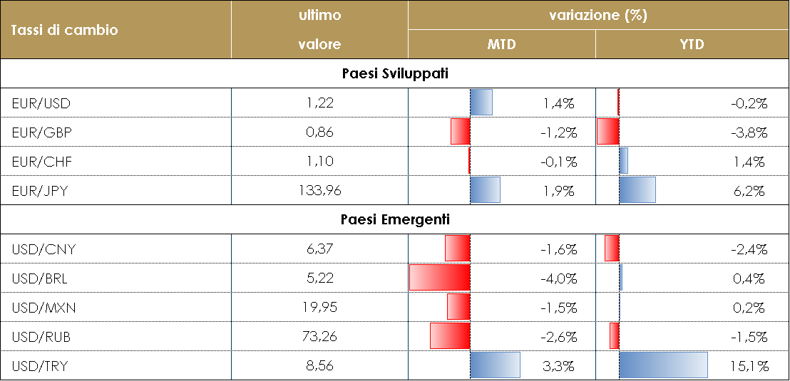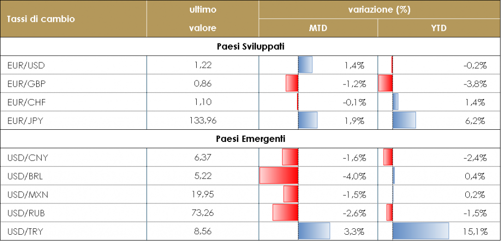 PERFORMANCE – Dati aggiornati alle ore 17.30 del 18 giugno 2021 TASSI DI CAMBIO L’appuntamento con il FOMC di mercoledì ha fornito il motivo per un significativo movimento dei tassi reali statunitensi. Come accaduto tra la metà di febbraio e l’inizio di marzo, un aumento dei tassi reali ha fornito supporto al dollaro USA anche questa volta.Il dollaro statunintese ha guadagnato contro ciascuna delle valute del G10: contro l’euro, il dollaro è passato da 1,214, pochi minuti prima della riunione del FOMC, a 1,19 alla fine della settimana. La valuta con la peggiore performance contro il biglietto verde è stata la corona svedese, insieme al dollaro australiano e alla corona norvegese che hanno perso rispettivamente il 2,7%, il 2,1% e il 2,6%.Anche le valute dei mercati emergenti hanno perso terreno rispetto al dollaro americano. L’unica eccezione è stata il Real brasiliano, che ha chiuso la settimana guadagnando più del 2%. Le valute con la peggiore performance sono state il fiorino ungherese e la lira turca, entrambe hanno perso più del 3%.Il movimento del dollaro è stato probabilmente esacerbato dal posizionamento del mercato: prima della riunione del FOMC, un dollaro più debole era la visione di consenso, quindi l’apprezzamento iniziale ha guadagnato. A cura del team obbligazionario di Mediobanca SGR PERFORMANCE TASSI DI CAMBIO-Dati aggiornati alle 17.30 del 18 giugno 2021 |