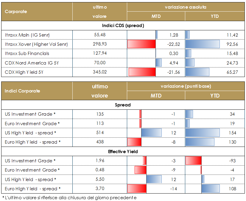 Nel corso di questa settimana il settore corporate ha tradato in territorio positivo, grazie alle rinnovate speranze dei vaccini e senza risentire eccessivamente degli stop lato Brexit. Mercoledì, i mercati hanno reagito non molto positivamente alla prudenza dimostrata dalla FED, anche se riteniamo che nel medio periodo le conferme sulla forward guidance rimangano un fattore positivo per i fondamentali del mercato.È stata una settimana molto positiva per gli indici CDS: Main -2bps; Xover-25bps; Financials -4bps & Subordinated -10bps.Sul secondario si è registrata una maggiore attività ancora a seguito di volumi inferiori al previsto nel primario in tutti i settori. Gli spread sono risultati marginalmente più stretti. Sul primario si sono registrate nuove emissioni per oltre 30 miliardi di euro contro i 43 miliardi di euro della settimana scorsa.  Nel settore finanziario emissioni in prevalenza Senior con Label ESG, SocGen (BBB, 1Bio, 8nc7), Commerzbank (BBB- 500Mio 5.5y) e Unipol (BB, 750Mio, 10y) mentre la parte junior della struttura del capitale è stata più tranquilla con deal su Insurance, Munich Re (A, 1.250Bio, 20nc10y) Su Corporate double tranche Green di VW (BBB, 1Bio each 8y e 12y) con book superiori a 11Bio, triple tranche per Coca Cola (A+, 8.5, 12.5, 19.5y tot. 2.6Bio), double per Digital Dutch (BBB, 2y e 11y) e Mondelez (BBB, 6 e 9y, 1.250Bio combined) e singoli deal per Novartis, Amadeus, Terna, Kion, Saton e Cassa Depositi e Prestiti (BBB, 750Mio 8y, btp+28) .