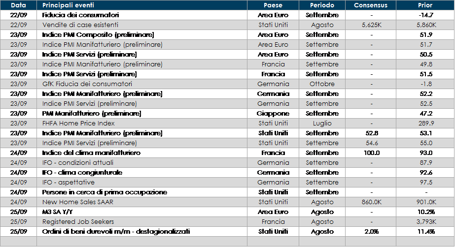 Europa: la settimana prossima saranno pubblicati i valori degli indici PMI preliminari di settembre. I dati consegneranno un’immagine del momentum della crescita dell’Area Euro nel mese di settembre, visto che alcuni dati europei hanno già mostrato segni di decelerazione. In Germania sarà pubblicato l’indice IFO relativo al mese di settembre.         Stati Uniti: anche negli Stati Uniti saranno pubblicati gli indici PMI, inoltre si avranno nuove indicazioni sulla salute del mercato immobiliare.