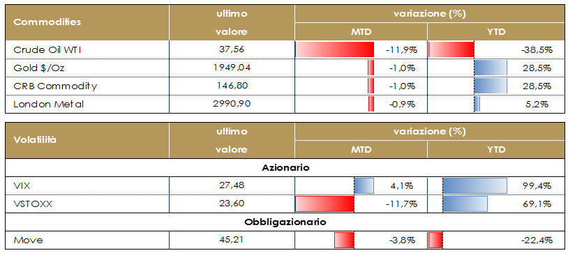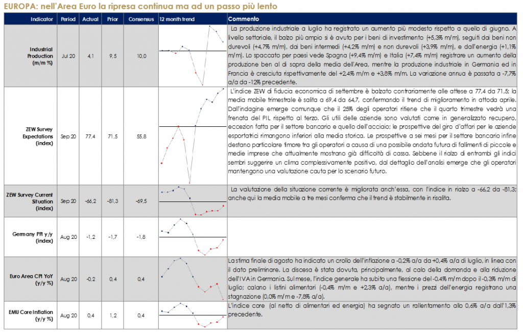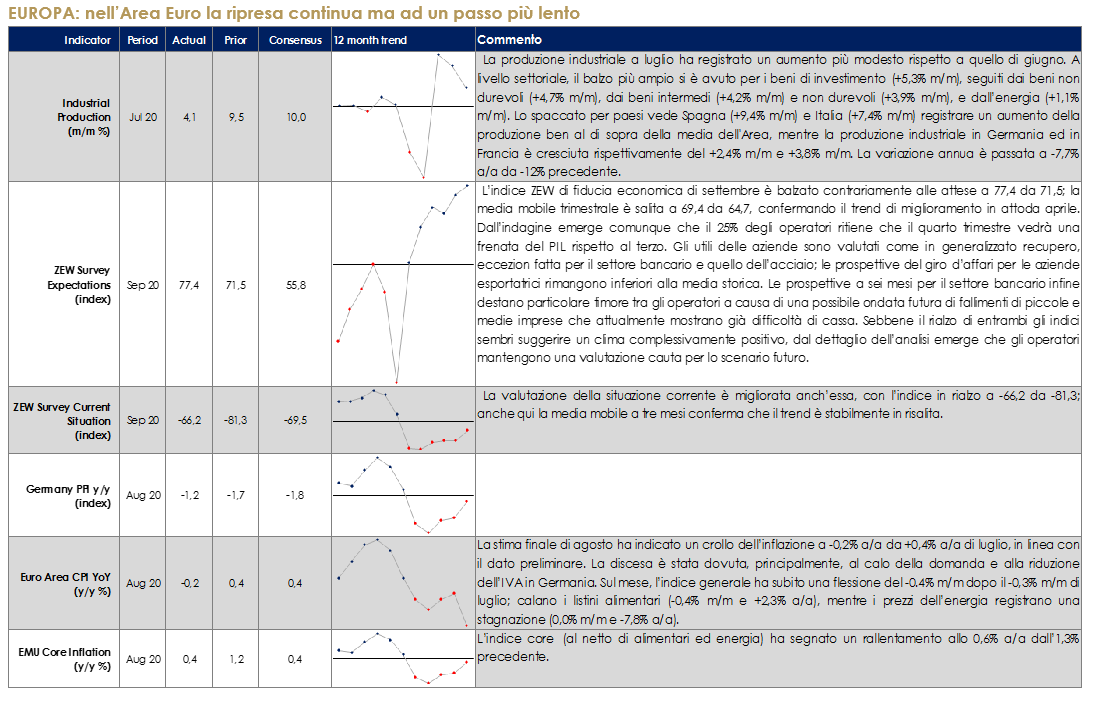 Il prezzo del petrolio è tornato sopra i 40 dollari al barile durante la settimana. Il guadagno è stato guidato sia dal dato positivo sulle scorte in calo, contrariamente alle attese, sia dalla chiusura di buona parte della produzione di greggio nel golfo del Messico a causa dell’uragano Sally. Positivo è stato anche l’esito del meeting dell’OPEC+ che ha riconosciuto la scarsa conformità di alcuni paesi e ha reiterato l’importanza di essere conformi al piano di tagli. L’OPEC* ha ribadito di voler mantenere un atteggiamento proattivo e preventivo per questo potrebbe essere indetta una riunione straordinaria già in ottobre, senza spettare la riunione prevista per il 30 novembre-1 dicembre: L’attuale programma di tagli prevede che l’OPEC+ aggiunga 2 mb/d di produzione in gennaio 2021. Tuttavia, guardando alle varie proiezioni della domanda petrolifera è atteso un limitato, se non nullo, aumento della domanda previsto per il primo trimestre del 2021, il che significa che il mercato potrebbe fare fatica ad assorbire questi barili aggiuntivi.