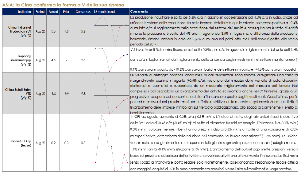 In Giappone, il nuovo segretario dell’LDP, Y. Suga è stato nominato primo ministro. Le informazioni preliminari sulla composizione del nuovo governo confermano la continuità attesa nella gestione della politica economica, con il rinnovo dei mandati per i ministri dell’economia, delle finanze, del commercio e della politica economica e fiscale. Il nuovo governo dovrebbe imprimere maggiore forza alla componente regolamentare e amministrativa, con la nomina di un nuovo ministro.