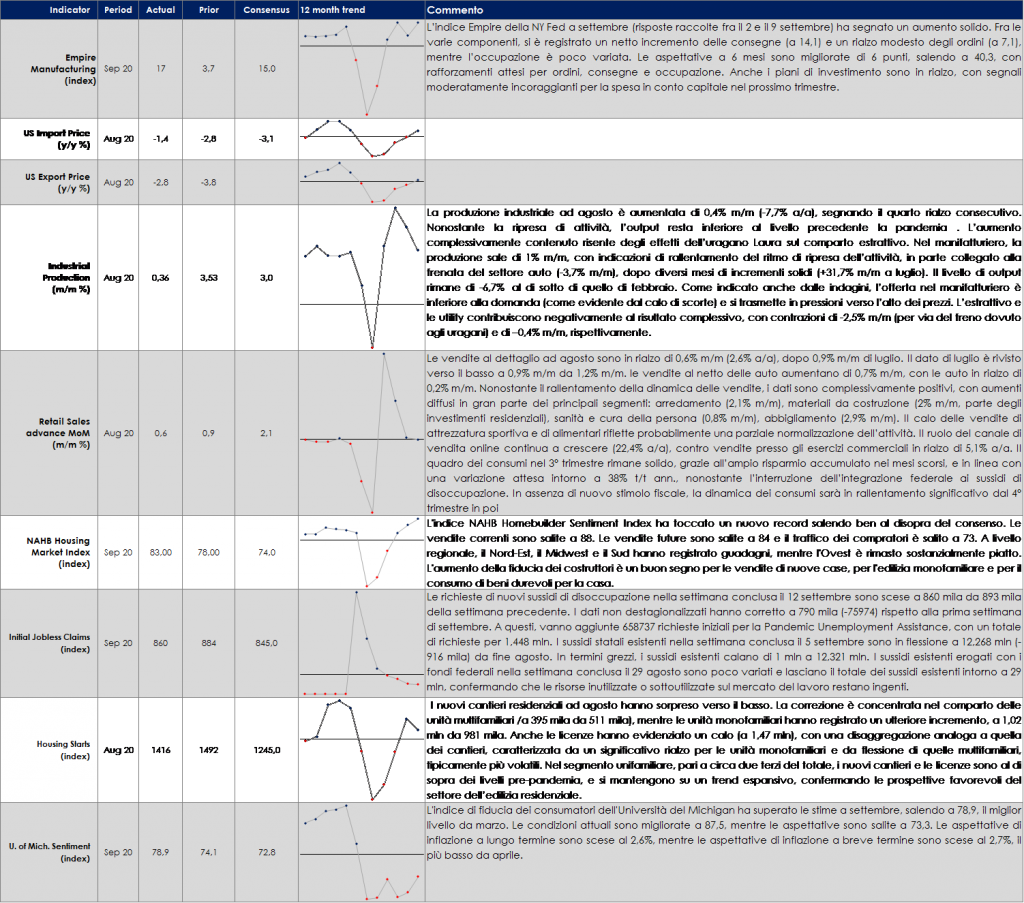 La riunione del FOMC di settembre ha lasciato invariate le proprie misure di politica monetaria. Per sostenere maggiormente le aspettative di mercato di tassi fermi ancora a lungo, il FOMC ha reso noto la nuova forward guidance, coerentemente alla revisione della strategia di politica monetaria annunciata a fine agosto a Jackson Hole. Lo stesso J. Powell ha definito tale svolta “appropriata” e “potente”.