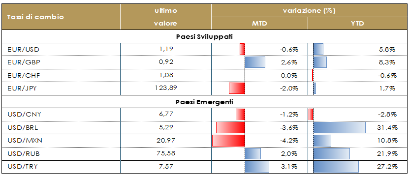 L’atteso meeting di politica monetaria della Federal Reserve Statunitense si è chiuso, come da attese, senza generare particolari picchi di volatilità nei mercati valutari: l’indicazione che i tassi di politica monetaria resteranno ancorati almeno fino a tutto il 2023 era già stato ampiamente scontato dai mercati e non ha, dunque, prodotto movimenti significati. Il USD si è leggermente apprezzato nei confronti dell’EUR (passando da 1.185 e a 1.175) in seguito al FOMC perché alcuni investitori si attendevano che la FED potesse aumentare i volumi di acquisto mensile di titoli, dagli attuali 80 miliardi di USD, focalizzandosi sui titoli a più lunga scadenza: l’assenza di questa manovra ha prodotto una chiusura di quelle posizioni consentendo al tasso di cambio di recuperare l’area 1.185 molto rapidamente.