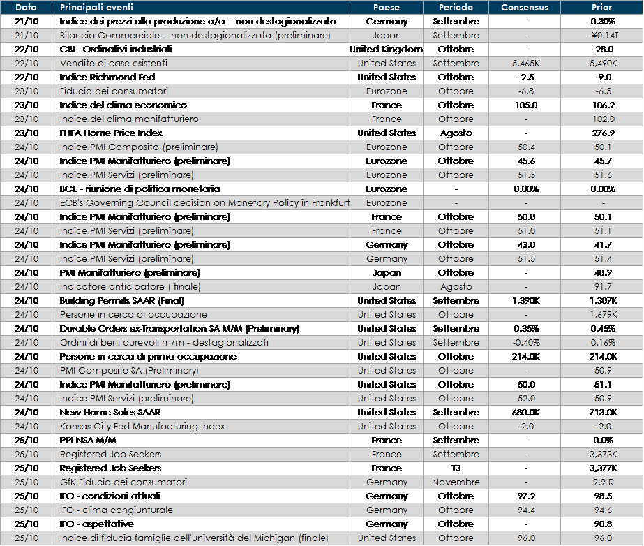 - Europa: in riferimento all’Area Euro a livello aggregato, la settimana prossima sarà pubblicato l’indice di fiducia dei consumatori, mentre per le singole economie saranno pubblicate le stime preliminari degli indici Markit PMI di ottobre. In Germania, in pubblicazione anche gli indicatori IFO e Gfk sulla fiducia.