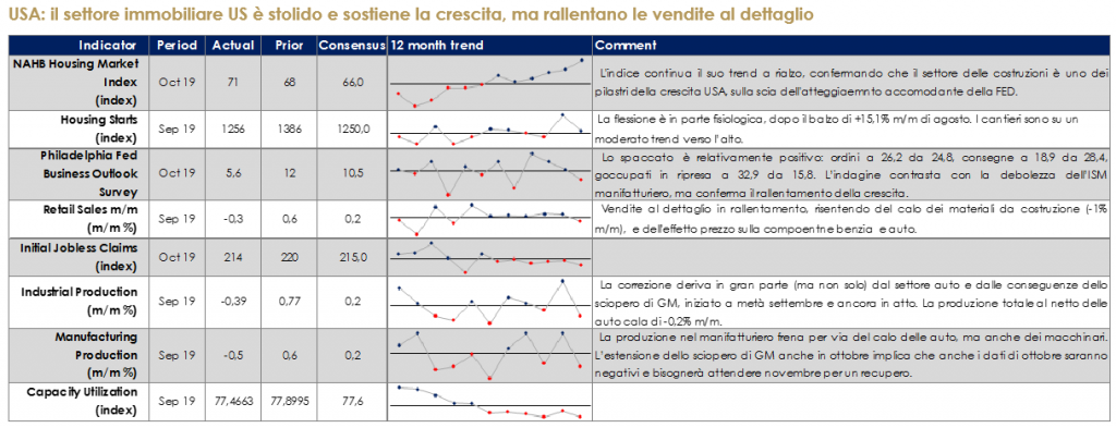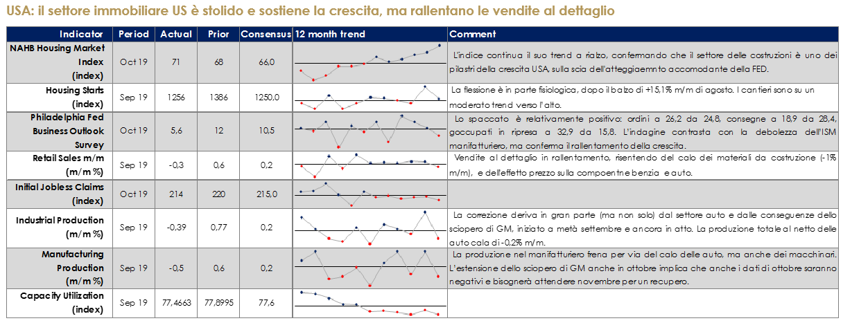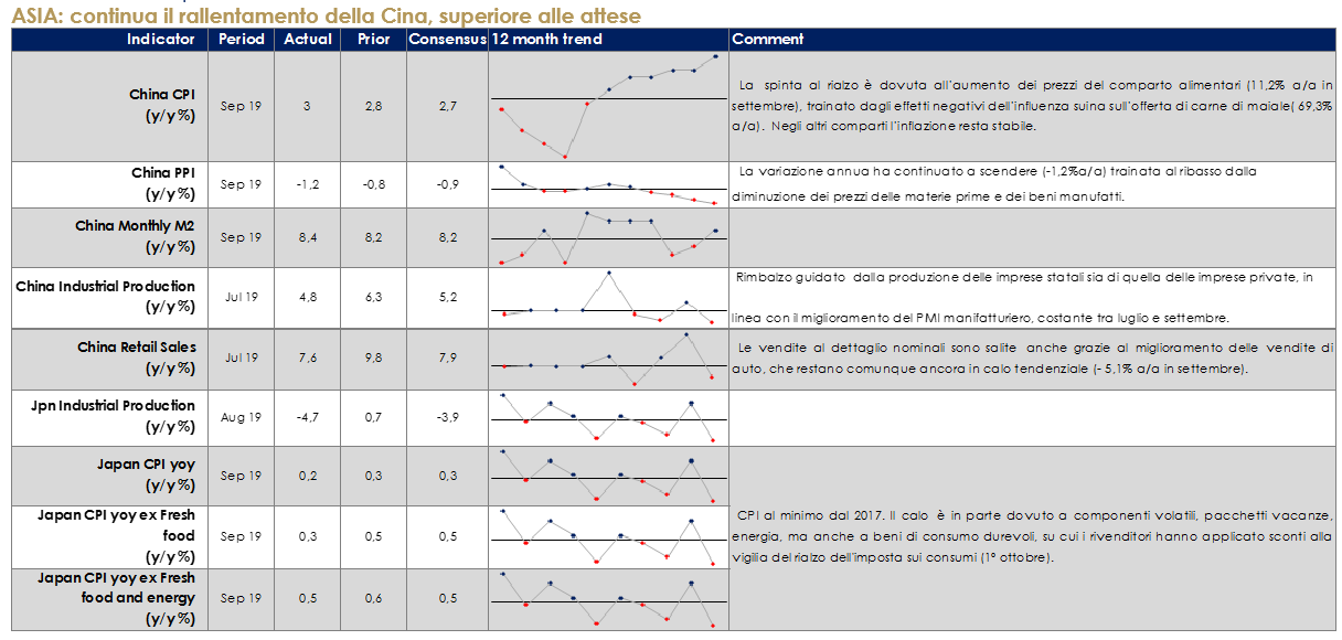 Il PIL cinese in T3 ha rallentato da 6,2% a/a in T2 a 6,0% a/a, al di sotto delle attese (consenso 6,1% a/a), con una variazione di 1,5% t/t, da 1,6% t/t in T2. Dal lato dell’offerta a una riaccelerazione nel settore dei servizi (+7,2% a/a da 7,0% nei due trimestri precedenti) si è accompagnato un netto rallentamento del settore industriale (da 5,6% a/a in T2 a 5,2% inT3) e in misura di minore, di quello agricolo. Il dato porta la crescita dei primi tre trimestri dell’anno a 6,2% i. La dinamica del credito aggregato si è stabilizzata a 10,8% a/a in settembre e non ha ancora dato segnali di riaccelerazione nonostante l’allentamento delle condizioni monetarie. L’impulso del credito, finora comunque in lieve aumento, dovrebbe favorire una stabilizzazione dell’attività economica in T4 premettendo una crescita tra il 6,2% e il 6,1% nel 2019.