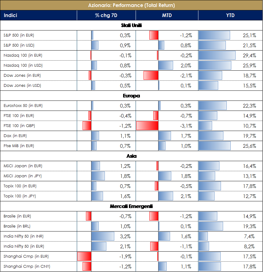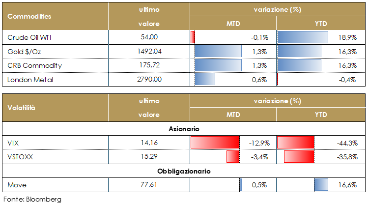 Il presente documento (il “Documento”) è stato preparato dalla Funzione Asset Allocation di Mediobanca SGR SpA (la “SGR”) a scopo puramente informativo. Il documento non ha carattere di offerta, invito ad offrire, o di messaggio promozionale finalizzato all’acquisto, alla vendita o alla sottoscrizione di strumenti/prodotti finanziari di qualsiasi genere. Inoltre, esso non è inteso a raccomandare o a proporre una strategia di investimento in merito a strumenti finanziari. In particolare il presente Documento non costituisce in alcun modo una raccomandazione personalizzata; lo stesso è stato predisposto senza considerare gli obiettivi di investimento, la situazione finanziaria o le competenze di specifici investitori. Il presente Documento è proprietà di Mediobanca SGR; esso non può essere riprodotto o pubblicato, nemmeno in una sua parte, senza la preventiva autorizzazione scritta della SGR. Le informazioni, opinioni, valutazioni e/o previsioni contenute nel presente Documento (le “Informazioni”) si basano su fonti ritenute autorevoli ed attendibili; tuttavia, la SGR non assume alcuna responsabilità per eventuali errori od omissioni né potrà considerarsi responsabile per le eventuali perdite, danni o conseguenze di qualsivoglia natura (legali, finanziarie o fiscali) che dovessero derivare dal fatto che si sia fatto affidamento su tale Documento. Ciascun investitore dovrà pertanto assumere le proprie decisioni di investimento in modo autonomo, tenuto conto delle sue caratteristiche e dei suoi obiettivi di investimento, e a tale scopo non dovrà basarsi, prioritariamente o esclusivamente, sul presente Documento. I rendimenti passati, eventualmente rappresentati nel Documento, non sono indicativi né garantiscono gli stessi rendimenti per il futuro. Le Informazioni contenute nel presente Documento costituiscono valutazioni aggiornate alla data della sua produzione e potrebbero variare nel tempo, senza necessità di comunicazione da parte della SGR.