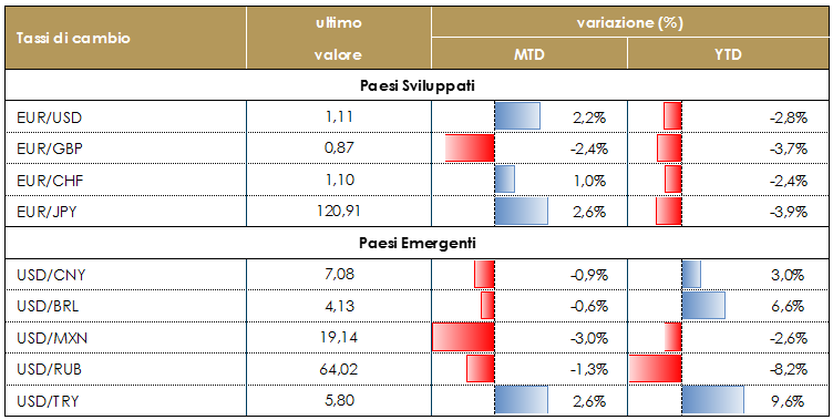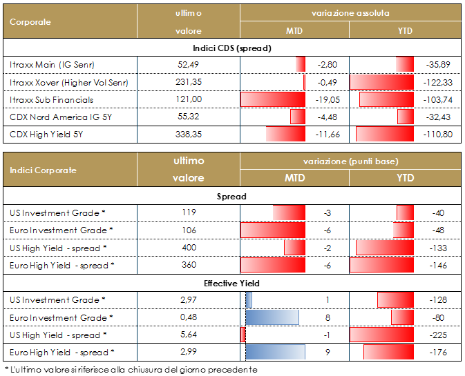 Prosegue il trend di restringimento del mercato corporate. Il mercato primario si è mantenuto molto attivo con emissioni su tutti i comparti. Su base settimanale, gli indici HY hanno avuto performance positiva (sia in Eur che US HY). Su Indici CDS, particolarmente liquidi, la settimana su Itraxx Xover (Hy) si è chiusa con un -7 (239 da 232) sui minimi della settimana. Itraxx Main (IG) ha chiuso a 53 (-2) mentre Sub Fin a 124 (-8); stessa dinamica, anche se lievemente migliore rispetto all’Europa, in US, con IG (-2) e HY (-9) nella settimana in cui sul fronte delle tensioni geopolitiche si sono registrati progressi significativi. Sul mercato primario, la settimana è stata ancora molto intensa. Su financial nuove emissioni per Anima holding spa (BBB- 300Mio Senior 7y 1.75%), Unicredit Leasing corp (BBB 300Mio Senior 2y 0.502%) e su subordinati assicurativi La mondiale (BBB- 500Mio Jr Subordinated Perp nc10 4.375%) con un libro degli ordini sovrascritto 10 volte l’ammontare in emissione. Su banche, emissioni senior non Preferred per Credit Agricole sa (A- 1Bio 5y 0.375%), UBI Banca (BB+ 500Mio 5y 1.625%) e Bpce sa (A- 1000Mio 7y 0.5%), senior per Sumitomo Mitsui (A- 1250Mio 10y 0.632%) e senior preferred per Banca Mcc spa (BB+ 300Mio 5y 1.5%), Banca Farmafactoring spa (300Mio 3y 1.75%) e Dz bank ag (AA- 250Mio 9y 0.205%). Su corporate doppia emissione subordinata per Deutsche Bahn (BBB 1Bio Perp nc 6y 0.95%, 1Bio Perp nc 10y 1.6%), mentre multitranche senior per Zf Europe (BBB- Senior 500Mio 4y 1.25%, 900Mio 6y 2%, 600Mio 8y 2.5%, 700Mio 10y 3%), Engie sa (A- Senior 900Mio 11y 0.5% 600Mio 22y 1.25%) e E.on se (BBB Senior 750Mio 7y 0.25%, 750Mio 3y 0%). Due emissioni singole per Informa plc (BBB- 500Mio Senior 8y 1.25%) e Cpi Property group sa (BBB 750Mio Senior 7y 1.625%). Settimana record anche per le emissioni nel comparto High Yield, con rifinanziamenti e nuove emissioni per Rossini sarl (B 650Mio 6y 3.44071%), Ziggo bv (BB 425Mio 10y 2.875%), Consus real estate (B- 450Mio 4y 9.625%), Apicil prevoyance (NR 250Mio Insurance Subordinated 10y 4%), Hornbach baumarkt ag (B 250Mio 7y 3.25%), Selecta group bv (B 375Mio 4y 5.375%), Eircom finance (B+ 350Mio 5y 1.75%). A cura del team obbligazionario di Mediobanca SGR |