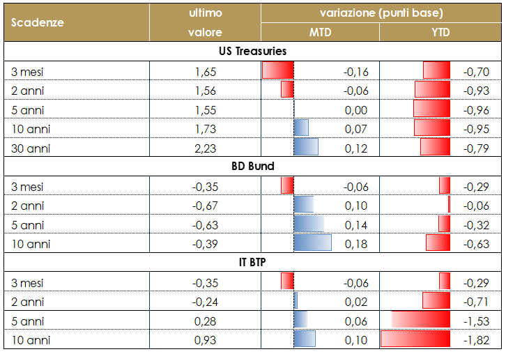 Durante la settimana appena conclusasi la struttura a termine US è rimasta pressoché invariata nonostante le notizie di progressi relativi sulle relazioni USA-Cina e sul tema Brexit. A nostro avviso il fatto che l’accordo Brexit non sia stato ancora approvato dal parlamento UK e che l’accordo USA-Cina non sia stato accompagnato da una dichiarazione congiunta lascia gli investitori cauti. In attesa che il Parlamento UK e quello Europeo votino sul nuovo accordo di ritiro del Regno Unito, il Gilt decennale ha registrato solo un marginale rialzo, mentre il segmento a breve è rimasto ancorato. Il marginale movimento è spiegato dall’elevata incertezza che ancora permane: le possibilità di un no-deal Brexit sono diminuite, ma le prospettive a lungo termine per il paese restano ancora molto incerte. Non è chiaro se, anche dopo avere ottenuto la modifica dell’accordo, il Primo ministro Johnson abbia i voti utili per farlo approvare dal Parlamento UK. La battaglia è aperta su almeno tre fronti. Innanzitutto, gli unionisti nordirlandesi hanno preannunciato un loro voto contrario. C’è poi da capire se i 21 conservatori che sono stati estromessi dal partito a settembre abbiano intenzione di esprimersi in senso favorevole o meno. Infine, se anche questi 21 conservatori “soft” fossero persuasi, non si sa come voteranno i 38 conservatori “hard” che a marzo di quest’anno hanno votato contro l’accordo di Theresa May. Infine, i laburisti di Jeremy Corbyn hanno già fatto conoscere la loro contrarietà. Per questo i possibili scenari possibili spaziano ancora da Hard Brexit, a un Brexit più morbida fino ad un “remain” con un nuovo governo e un secondo referendum. La struttura a termine governativa tedesca ha invece registrato un marginale rialzo lungo tutte le scadenze. La settimana prossima si terrà l’ultima riunione della BCE, presieduta da Mario Draghi, sarà interessante ascoltare la valutazione della congiuntura economica e la valutazione degli strumenti a disposizione della BCE, mentre non vi saranno evidentemente annunci di nuove misure.
