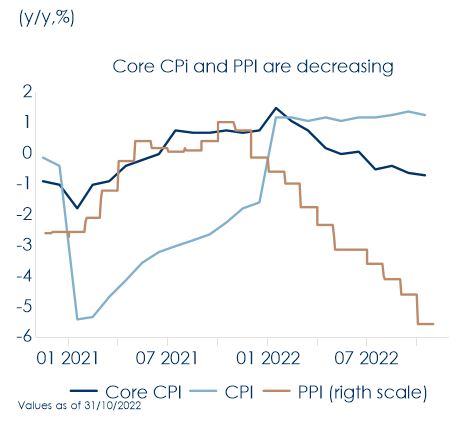| Le difficoltà macroeconomiche della Cina persistono, a causa del protrarsi della crisi immobiliare e dell’emergenza sanitaria del coronavirus. I dati sull’attività economica di ottobre, pubblicati in settimana, mostrano un ampio deterioramento rispetto a settembre, attestandosi al di sotto delle aspettative di mercato. La produzione industriale è aumentata del 5,0% a/a contro il 5,3% del consensus e il 6,3% di settembre. La produzione di computer e chip è calata bruscamente. La domanda interna è debole: le vendite al dettaglio sono scese dello 0,5%, segnando il primo calo da maggio, contro il consensus che prevedeva un aumento dello 0,7% e del 2,5% a settembre. Diverse componenti della domanda interna hanno registrato un calo, tra cui la ristorazione, l’abbigliamento, gli elettrodomestici, l’arredamento e le apparecchiature per le comunicazioni. Gli investimenti in capitale fisso sono aumentati meno delle attese e del mese precedente (+5,5%). Gli investimenti immobiliari sono diminuiti dell’8,8% su base annua nel periodo gennaio-ottobre. Il tasso di disoccupazione è rimasto stabile al 5,5%. I dati di inflazione mostrano che il paese è in deflazione (Fig.1).