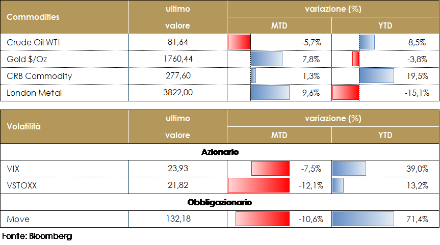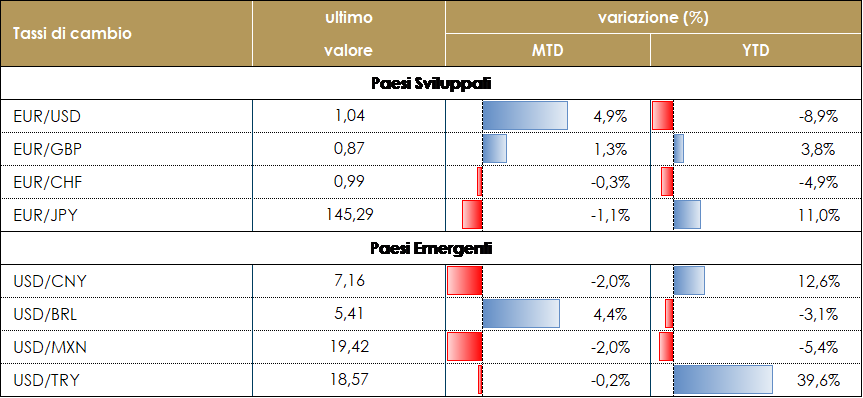 L’avversione al rischio resta il sentimento dominante fra gli investitori che temono un calo della domanda di materie prime a causa del rallentamento economico in atto. Il prezzo del petrolio è debole, sotto gli 80 dollari al barile, con il mercato future scivolato nuovamente in contango. Il TTF resta sopra i 110 euro per Megawattora. Prosegue il dialogo a livello europeo sul meccanismo di limitazione del prezzo del gas (l’appuntamento chiave resta però il Consiglio Europeo sull’Energia del 24 novembre. Le materie prime agricole beneficiano dell’annuncio del prolungamento dell’accordo per il trasporto dei cereali dal Mar Nero. L’attuale corridoio navale resterà in vigore per altri 120 giorni, a partire dalla scadenza del 19 novembre, uno scenario che sembra rassicurare sulle future forniture. TASSI DI CAMBIO La scorsa settimana ha registrato dei movimenti sul mercato FX decisamente contenuti, in particolare se confrontati a quelli delle settimane precedenti. All’indomani delle riunioni delle banche centrali e dei dati sull’indice dei prezzi al consumo negli Stati Uniti, la volatilità del mercato è diminuita rapidamente, con una price action contenuta per le principali valute. Il dollaro ha recuperato parzialmente nei confronti della corona svedese e della corona norvegese (oltre il 2% la perdita registrata da entrambe le valute), mentre ha chiuso la settimana sostanzialmente invariato nei confronti di tutte le altre valute dei mercati sviluppati. Lo stesso è accaduto nei mercati emergenti: tutte le principali valute sono rimaste in un range compreso tra +1% e -1% rispetto al dollaro durante la settimana, con la notevole eccezione del peso cileno e del peso colombiano. Su entrambe le valute sudamericane ha pesato il ribasso delle materie prime, in particolare del rame che ha perso oltre il 2% durante la settimana. Inoltre, il Peso colombiano è stato venduto in quanto il governatore della Banca Centrale ha abbassato le aspettative sul tasso di crescita del PIL e ha ribadito che l’orientamento di politica monetaria rimarrà restrittivo ancora per un po’. A cura del team obbligazionario di Mediobanca SGR |