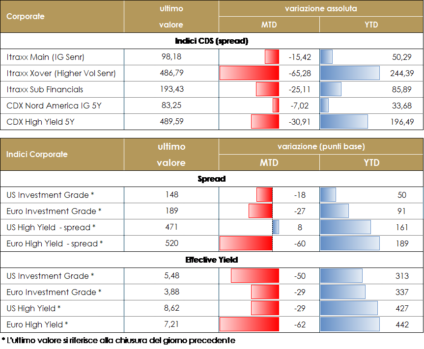 Nell’ultima settimana il mercato corporate ha avuto una performance lievemente positiva con un rallentamento del trend di restringimento del periodo precedente ma ancora flussi segnalati sia nel mercato primario che in quello secondario. Dopo che nelle settimane scorse le banche centrali e i dati di inflazione avevano portato direzionalità e forti movimenti nel mercato, in questa settimana priva di sostanziali appuntamenti la volatilità è tornata a scendere con i relativi benefici effetti sul mercato del credito e sulla propensione al rischio. I flussi sull’asset class e in particolare l’attività sul mercato sono ancora piuttosto positivi ma destinati a diminuire nel corso del prossimo periodo con l’avvicinarsi della chiusura dell’anno fiscale. Su base settimanale, inclusa la giornata odierna, gli Indici CDS hanno chiuso con un -10bp in europa su Itraxx Xover (Hy) e unchanged su CDX HY in US mentre su IG -2 su Itraxx Main (eur) e -1 su CDX IG. Sugli indici cash il total return è stato positivo prevalentemente su IG con performance vicine a +1% grazie prevalentemente alla discesa sulle curve governative mentre su High Yield dopo il buon risultato delle ultime settimane il periodo si è chiuso con una salita contenuta, prossima a 0.5% su US e inferiore ma positiva su EUR. Sul mercato primario numerose le nuove emissioni a testimoniare il rinnovato interesse sull’asset class; su finanziari segnaliamo i nuovi deal subordinati T2 per ABN AMRO (BBB- 1Bio 10.5nc5y, 5.125%), ASR Ned (BBB- 1Bio 21nc11y 7%) e Caixabank (BBB- 750Mio 11.5nc5y 6.25%) mentre su senior deal preferred per Banca Mediolanum (BBB 300Mio 4nc3y 5.035%), National Bank of Greece (B+ 500Mio 5y 7.25%), Pireaus (4y 8.25%) e BPCE (10y); emissioni senior non preferred per ABN Amro (7y e 12y), Banco BPM (5y), Arval Leasing (4.5y). Non meno attivo il comparto dei corporate non finanziari con i double tranche per Adidas (A+ 500Mio 3y 3%, 7y 3.125%), ENBW (A- 500Mio 4y 3.625% e 7y 4.05%), Iberdrola (BBB+ 6y 3.125% 10y 3.375%), Thermo Fisher (A- 4y 3.2% 12y 3.65%) Vonovia (BBB+ 3.5y 4.75% e 8y 5%) e singola emissione per Paccar (3y 3.25%) A cura del team obbligazionario di Mediobanca SGR VIEW STRATEGICA Corporate IG: Il livello e le valutazioni degli spread rendono vulnerabile l’asset class rispetto alle variazioni dei tassi e all’inizio della normalizzazione delle politiche monetarie e potrebbero risentirne della volatilità che prevediamo in aumento. La ricerca di rendimento, la stagionalità che torna positiva e l’offerta netta contenuta prevista rimangono fattori tecnici supportivi. Esprimiamo una view neutrale. Corporate HY: Outlook neutrale dati i livelli raggiunti dalle valutazioni nonostante alcuni fattori, prevalentemente tecnici, e la ricerca di rendimento in assenza di alternative nel campo obbligazionario ci rendono costruttivi verso l’asset class ma necessariamente selettivi dato il prevedibile aumento del rischio idiosincratico in questa fase del ciclo. |