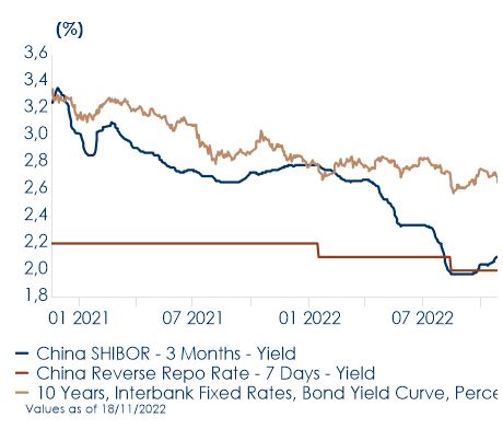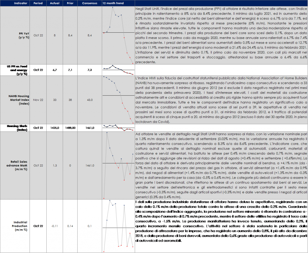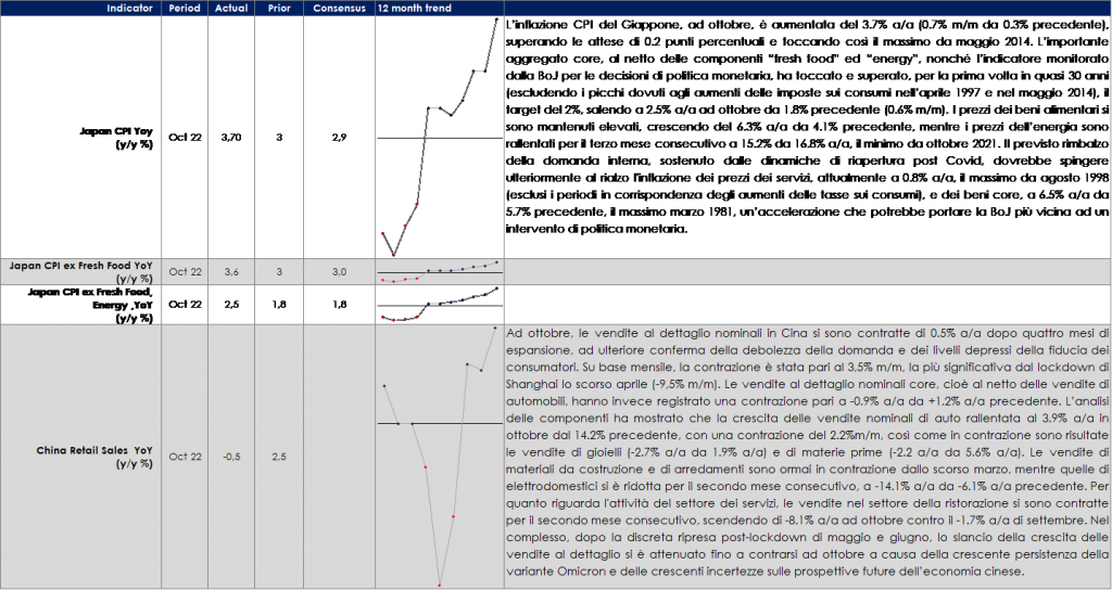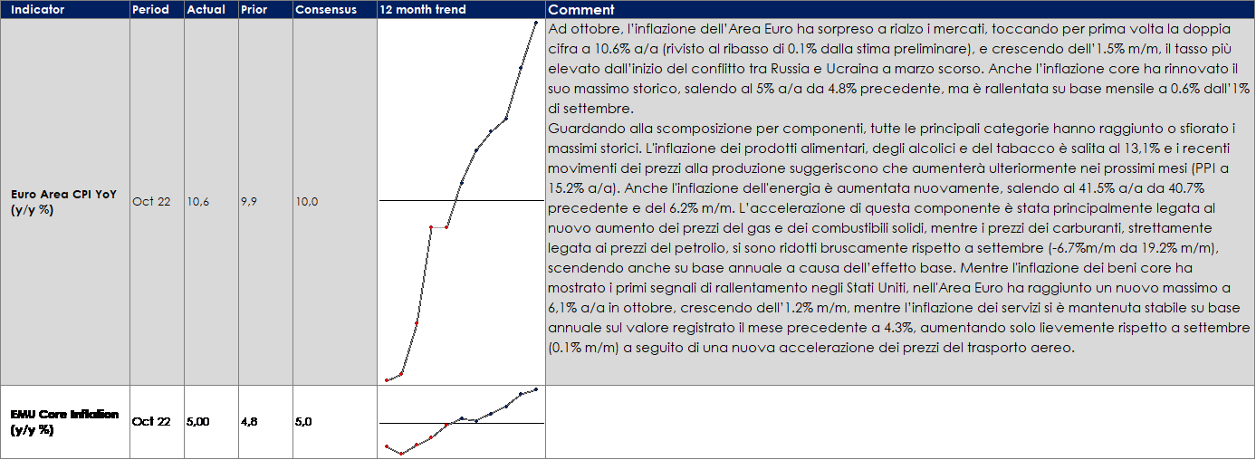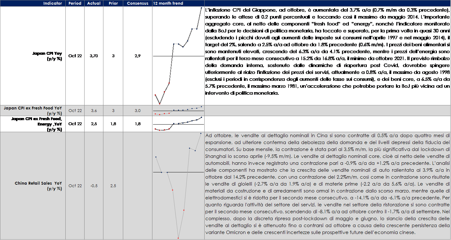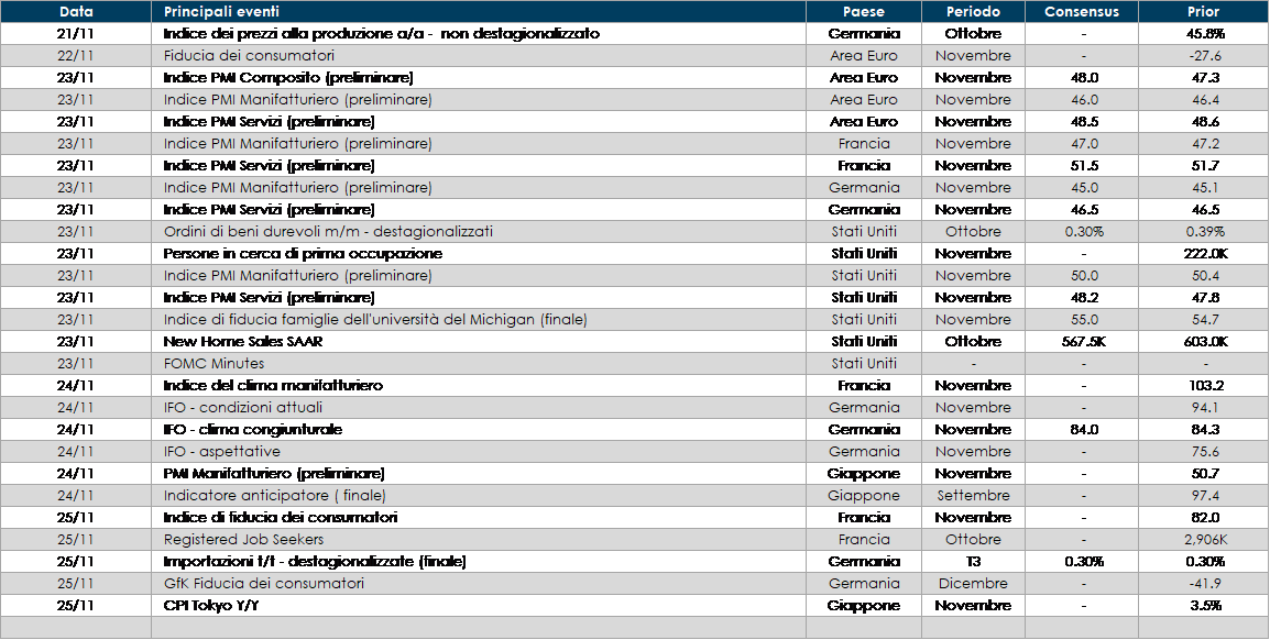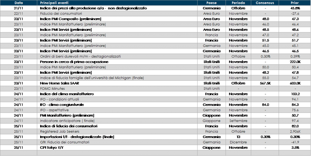 - Europa: la settimana prossima sarà pubblicata la seconda release del PIL della Germania relativo a T3, con la scomposizione per componenti che dovrebbe dare maggior chiarezza su quale sia stato il principale driver di crescita. Il governo italiano invierà alla Commissione Europea il suo bilancio 2023. Inoltre, saranno pubblicati i resoconti dell’ultima riunione di fine ottobre della BCE, che però non dovrebbero fornire anticipazioni né sull’entità del prossimo rialzo dei tassi né sulla futura evoluzione del Quantitative Tightening. Infine, le prime indagini congiunturali di novembre – i PMI della Area Euro, della Germania e della Francia, nonché l’indagine tedesca Ifo – dovrebbero dare maggiori dettagli sulla probabilità che l’Area scivoli in recessione.