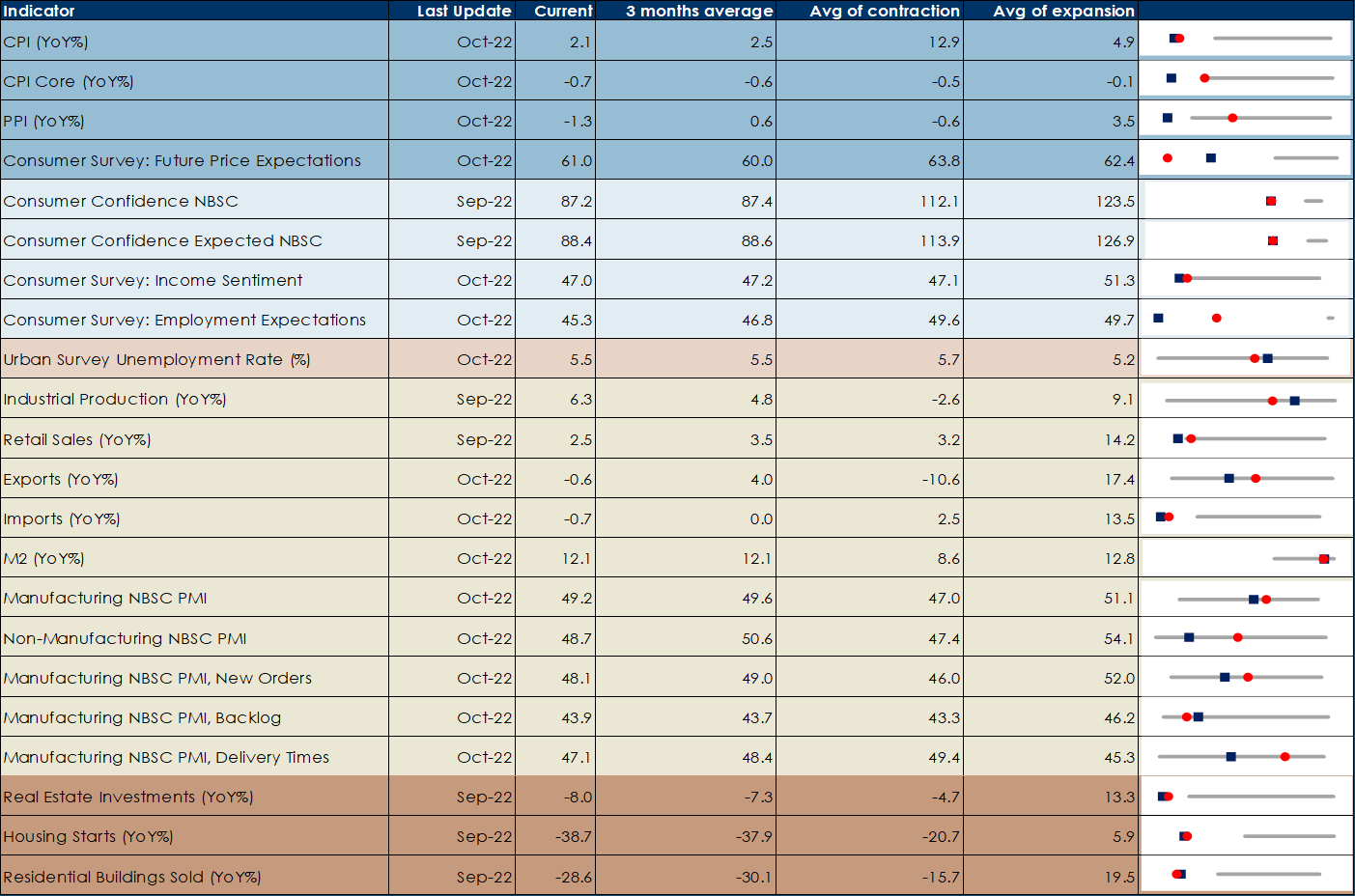 La seguente tabella fornisce un quadro sintetico della congiuntura economica cinese, confrontando l’ultimo valore del dato analizzato (quadratino blu), con la sua media mobile a tre mesi (pallino rosso) e l’intervallo di variazione della stessa in un intervallo che ha come minimo la media della variabile nelle fasi di recessione (che per la Cina coincidono i periodi 08/1988–12/1989; 12/2019 –03/2020) e come massimo la media della variabile nelle fasi di espansione. Si ottiene così un’immagine immediata di quali siano i settori maggiormente in difficoltà per l’economia cinesie in questo momento. Ne emerge con chiarezza la debolezza del mercato immobiliare, della domanda interna, la debolezza della fiducia dei consumatori e l’andamento deflattivo dei prezzi.