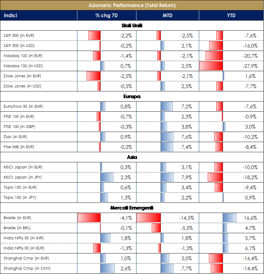 I mercati azionari europei e statunitense stanno per chiudere la settimana con un’intonazione positiva, nonostante la risalita dei tassi. I mercati si trovano in una fase “interlocutoria” nella quale, per potersi spingere oltre, necessitano di maggiori evidenze con riferimento alle principali tematiche attualmente al centro dell’attenzione. Il dato soft del CPI di ottobre ha favorito l’ottimismo di un Fed-Pivot, ma i commenti successivi dei vari Fed speakers hanno fatto un certo push-back indicando la necessità di un terminal rate più elevato. Il dato forte delle retail sales ha suggerito che un soft landing non è qualcosa di impensabile, ma allo stesso tempo le survey manifatturiere dipingono un’immagine un po’ diversa. In China l’allenamento delle restrizioni per il covid ha attirato flussi di investimento verso i mercati Asiatici, ma il mercato vuole vedere la rimozione di tutte le misure zero-covid e l’implementazione di misure di supporto alla crescita. È molto probabile che in questo regime, il mercato si muova in un contrarian mode fino a che i dati non confermeranno effettivamente il nuovo trend ed è bene sottolineare che quando le narrative si spingono troppo in una data direzione in relazione ad un tema particolare, il risk-reward si sposta dall’altro lato. Nel frattempo è continuata la reporting in settimana con notizie mediamente più positive che negative sia in Europa (bene per esempio Siemens e Infineon), sia in US (bene Home Depot, Walmart, Cisco, Nvidia).L’indice S&P si avvia a chiudere la settimana con una performance flat, trainato da Apparel Retail +10%, Specialty Stores 5% e Communications Equipment +5%; i peggiori Home Furniture -8%, Oil&Gas -7% e Commodity Chemicals -6%; a livello di singole società Bath&Body Works +9%, CBOE Global +7% e Moderna +7% le migliori; Advance Auto Parts -20%, Albemarle Corp -15% e Capital One Financial -14% le peggiori. Anche l’indice del Nasdaq 100 prossimo alla neutralità, guidato da JD.COM +17%, Baidu +11% e Netease +10%; i peggiori Lucid Group -11%, Align Tech -11% e Docusign -10%. Perfomance marginalmente positiva per l’indice Stoxx600, con Banche +2.5%, Utilities +2% e Personal Care and Grocery Stores +2% i settori migliori; Real Estate -3%, Constructions&Materials -2.5% e Auto&Parts -2% i settori peggiori; sui singoli nomi Teleperformance +19%, Drax Group +13.5% e Centrica +13% i migliori; Ambu -21%, Harbour Energy -17% e Bridgepoint Group -16% i peggiori. Leggermente positiva la chiusura settimanale anche del mercato azionario italiano con l’indice FTSE MIB a +0.5%, guidato da Banco BPM +6%, Finecobank +4% e Stmicroelectronics +4%; i peggiori Nexi -11%, Amplifon -5% e Telecom Italia -5%. Negativa invece la performance del’indice Mid Cap Italia a -1.5% con Enav +8%, Popolare Sondrio +7% e LU-VE +7% i migliori performers; Reply -11%, Gruppo Mutuionline -10% e Cairo Communications -8% i peggiori performers. A cura del team Core Equity Value di MB SGR VIEW STRATEGICA La view sul comparto azionario continua ad essere costruttiva per un trimestre che, pur con una certa volatilità, presenta una buona crescita degli utili e una stagionalità attraente per le attività finanziarie rischiose. Tra i rischi a questo scenario un certo grado di rallentamento macroeconomico, la normalizzazione della politica monetaria (che potrebbe risentire di un tasso di inflazione più alto più a lungo) e i timori sul mercato immobiliare cinese. Azionario USA: i trend di lungo termine proseguono su traiettorie al rialzo sostenibili, il ciclo economico (pur in rallentamento) è ancora favorevole e le condizioni finanziarie rimangono accomodanti. Nell’attuale contesto geopolitico l’area statunitense appare favorita alla luce di 3 fattori: l’indipendenza energetica la rende meno fragile ai rialzi dell’oil, il livello dell’interscambio commerciale con la Russia è modesto ed infine la composizione dell’indice azionario la rende più resiliente agli attuali rischi. Azionario Europe: l’attuale situazione geopolitica e la dipendenza energetica dell’EMU suggeriscono di portare a neutrale l’esposizione sul settore. L’incertezza geopolitica resta, tuttavia, bilanciata da politiche fiscali espansive, marcato accomodamento monetario e dalla debolezza dell’EURO. Elementi di rischio da monitorare sono legati a un possibile inasprimento delle operazioni militari e alle conseguenti contromisure economiche. |