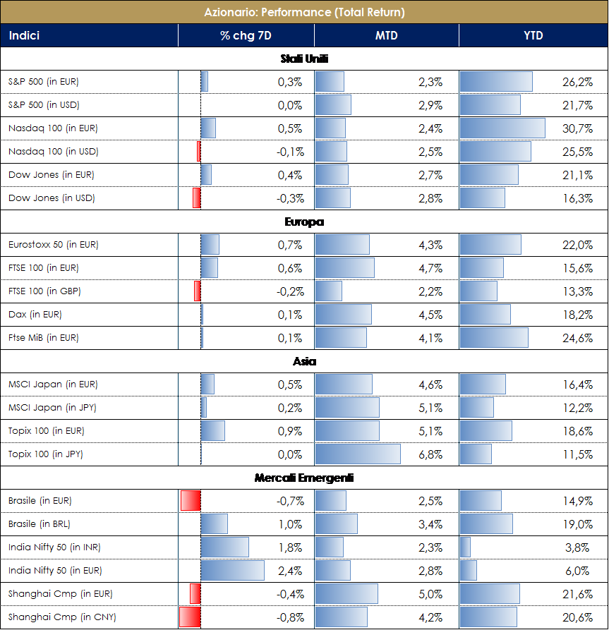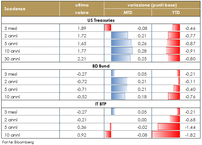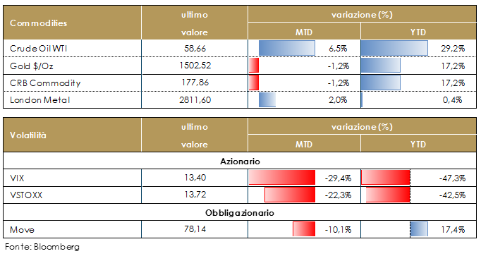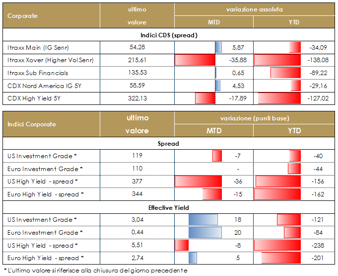 Il presente documento (il “Documento”) è stato preparato dalla Funzione Asset Allocation di Mediobanca SGR SpA (la “SGR”) a scopo puramente informativo. Il documento non ha carattere di offerta, invito ad offrire, o di messaggio promozionale finalizzato all’acquisto, alla vendita o alla sottoscrizione di strumenti/prodotti finanziari di qualsiasi genere. Inoltre, esso non è inteso a raccomandare o a proporre una strategia di investimento in merito a strumenti finanziari. In particolare il presente Documento non costituisce in alcun modo una raccomandazione personalizzata; lo stesso è stato predisposto senza considerare gli obiettivi di investimento, la situazione finanziaria o le competenze di specifici investitori. Il presente Documento è proprietà di Mediobanca SGR; esso non può essere riprodotto o pubblicato, nemmeno in una sua parte, senza la preventiva autorizzazione scritta della SGR. Le informazioni, opinioni, valutazioni e/o previsioni contenute nel presente Documento (le “Informazioni”) si basano su fonti ritenute autorevoli ed attendibili; tuttavia, la SGR non assume alcuna responsabilità per eventuali errori od omissioni né potrà considerarsi responsabile per le eventuali perdite, danni o conseguenze di qualsivoglia natura (legali, finanziarie o fiscali) che dovessero derivare dal fatto che si sia fatto affidamento su tale Documento. Ciascun investitore dovrà pertanto assumere le proprie decisioni di investimento in modo autonomo, tenuto conto delle sue caratteristiche e dei suoi obiettivi di investimento, e a tale scopo non dovrà basarsi, prioritariamente o esclusivamente, sul presente Documento. I rendimenti passati, eventualmente rappresentati nel Documento, non sono indicativi né garantiscono gli stessi rendimenti per il futuro. Le informazioni contenute nel presente Documento costituiscono valutazioni aggiornate alla data della sua produzione e potrebbero variare nel tempo, senza necessità di comunicazione da parte della SGR.