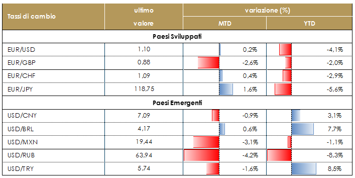 Sui mercati finanziari, un aumento persistente del prezzo del petrolio si tradurrebbe in un rafforzamento del dollaro US. Infatti, solitamente quando uno shock di offerta muove al rialzo il prezzo del petrolio, il dollaro US si rafforza e cala la propensione al rischio degli investitori.