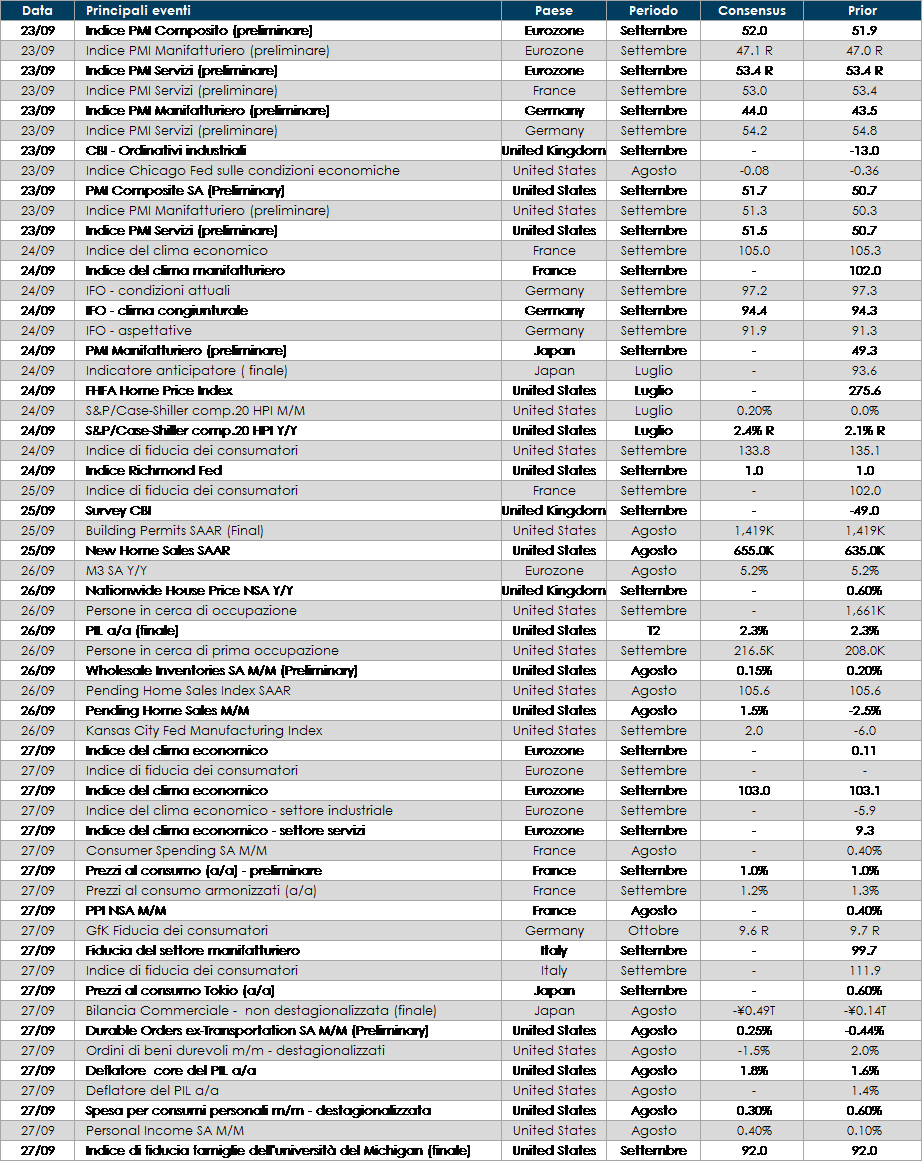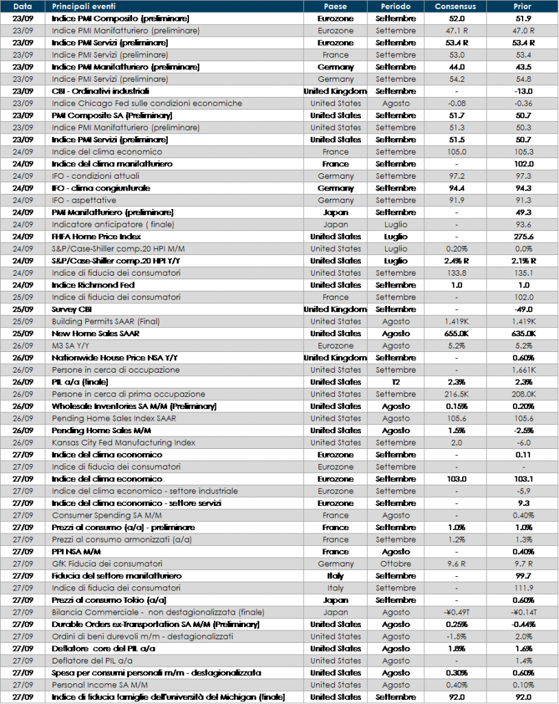 - Stati Uniti: attesi i numeri degli indici PMI preliminari di settembre e diverse indicazioni sulla fiducia, insieme alla stima finale del PIL di T2.