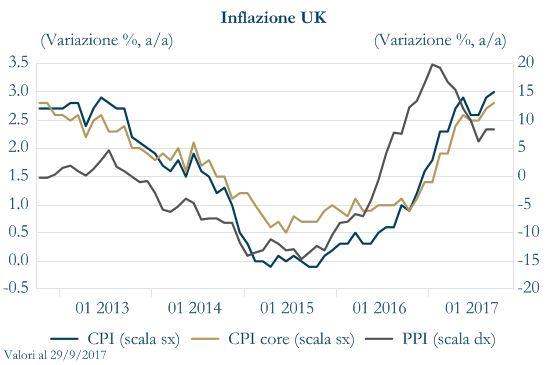 Negli ultimi trimestri, il deprezzamento della sterlina ha originato importanti pressioni al rialzo sui prezzi nel Regno Unito, portando l’inflazione al consumo marcatamente al di sopra del target della Bank of England (BoE). In settembre l’inflazione al consumo headline si è attestata al 3% e quella core al 2,75%, mentre un’ulteriore spinta inflattiva è in pipeline e dovrebbe scaricarsi sui prezzi al consumo nei prossimi mesi, come indicato sia dall’andamento dei prezzi alla produzione (i prezzi alla produzione hanno accelerato a 8.4% a/a in agosto, da un precedente 7.6%) sia dall’ultimo report dei PMI che hanno evidenziato rischi al rialzo del profilo di inflazione.
