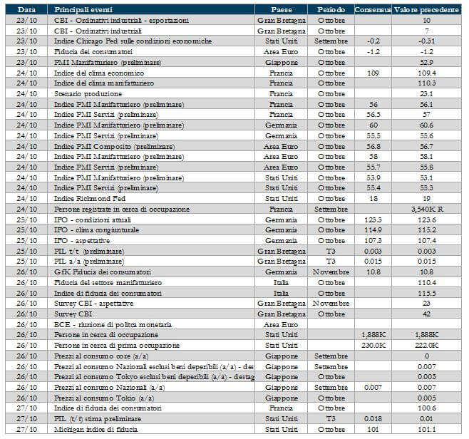 - Europa: attenzione rivolta principalmente alla riunione di politica monetaria della BCE Verranno pubblicate le stime preliminari degli indici PMI relativi ai diversi paesi dell’Area per il mese di ottobre;