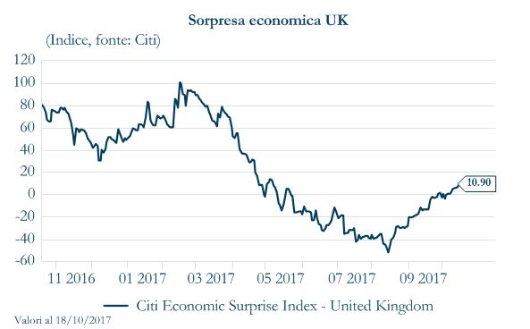 In questo contesto alcuni membri del Comitato di Politica Monetaria della BoE hanno evidenziato ripetutamente l’opportunità di normalizzare la politica monetaria e ridurre lo stimolo aggiuntivo introdotto a seguito del referendum sulla permanenza della Gran Bretagna nell’UE, quando la BoE tagliò il costo del denaro di 25 pb e annunciò un’estensione del QE di 70 miliardi di sterline. L’impulso proveniente da questa ulteriore manovra di QE equivale a 100 pb di riduzione nel tasso di interesse, come suggerito dal capo economista della BoE Haldane. Già nell’Inflation Report di agosto la BoE ha alzato le proprie previsioni di inflazione, segnalando la necessità di aumentare il costo del denaro più di quanto fosse stato evidenziato precedentemente per contenere l’inflazione. Nell’ultimo meeting tre degli attuali 8 membri del Comitato avrebbero voluto aumentare il costo del denaro. Chi invece ha votato per mantenere i tassi al livello corrente sottolinea la mancanza di pressione salariale e il timore che un aumento del costo del denaro potrebbe mettere a rischio il ribilanciamento della crescita in atto. Infatti, nei primi mesi dell’anno l’attività economica è rimasta debole, risentendo dell’impatto sui redditi delle famiglie dell’inflazione crescente e della diminuzione dei salari reali – nonostante il mercato del lavoro in miglioramento – ma, allo stesso tempo, si sta anche realizzando una rotazione dai consumi a favore degli investimenti e delle esportazioni che ne contrasterebbero in parte il rallentamento in prospettiva. Recentemente due fattori aumentano la probabilità di un rialzo nel prossimo meeting di novembre: da un lato i mercati sono stati preparati e prezzano un rialzo del costo del denaro all’84%, dall’altro gli indici di sorpresa economica nell’ultimo mese sono tornati a crescere, riportandosi in territorio positivo e lasciando intravedere un miglioramento della congiuntura economica del paese nei prossimi mesi. Per questo, riteniamo che il primo aumento del costo del denaro potrebbe essere annunciato già nel prossimo meeting del 2 novembre, a cui dovrebbero seguire altri due rialzi nel corso del 2018.