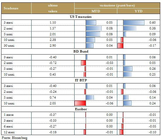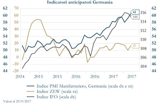 In Germania l’indice ZEW sulle aspettative degli analisti nel mese di ottobre delude le previsioni di consenso, realizzando solo un incremento marginale a 17.6 da 17 (consenso pari a 20). L’indice rimane al di sotto della media di lungo termine ma continua ad indicare un miglioramento delle condizioni di business all’inizio di T4. Viceversa, risulta in flessione l’indice delle condizioni correnti, che passa a 87 da 87.9 (contro una previsione di un moderato incremento a 88.5). Per l’Area Euro nel suo complesso la stima definitiva conferma l’inflazione stabile all’1.5% a settembre.
