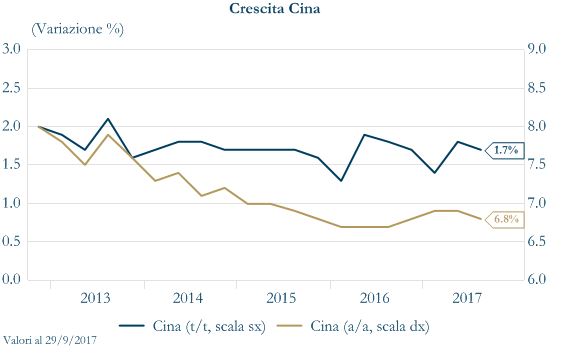 La Cina chiude T3 con un Pil in rialzo del 6.8% a/a, in leggera decelerazione dal 6.9% di T2, ma mantenendosi al disopra del target del 6.5% annunciato dal Governo per il 2017. I driver principali sono stati i consumi e la domanda estera. Al contempo, in settembre la produzione industriale è cresciuta del 6.6% a/a, in accelerazione rispetto al 6.0% di agosto. La crescita, riferisce l’Ufficio nazionale di statistica, è la più solida da giugno a seguito della spinta data dal manifatturiero (+8.1% dal 6.9% di agosto), mentre il settore minerario cede ancora terreno (-3.8% da -3.4%) scontando gli