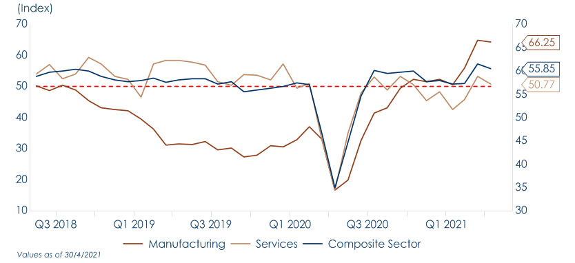 | Fig.1: Nel 2020 la Germania ha sperimentato una tra le contrazioni più basse di tutta Europa. Ora una attività economica in forte ripresa è segnalata dagli indici PMI …