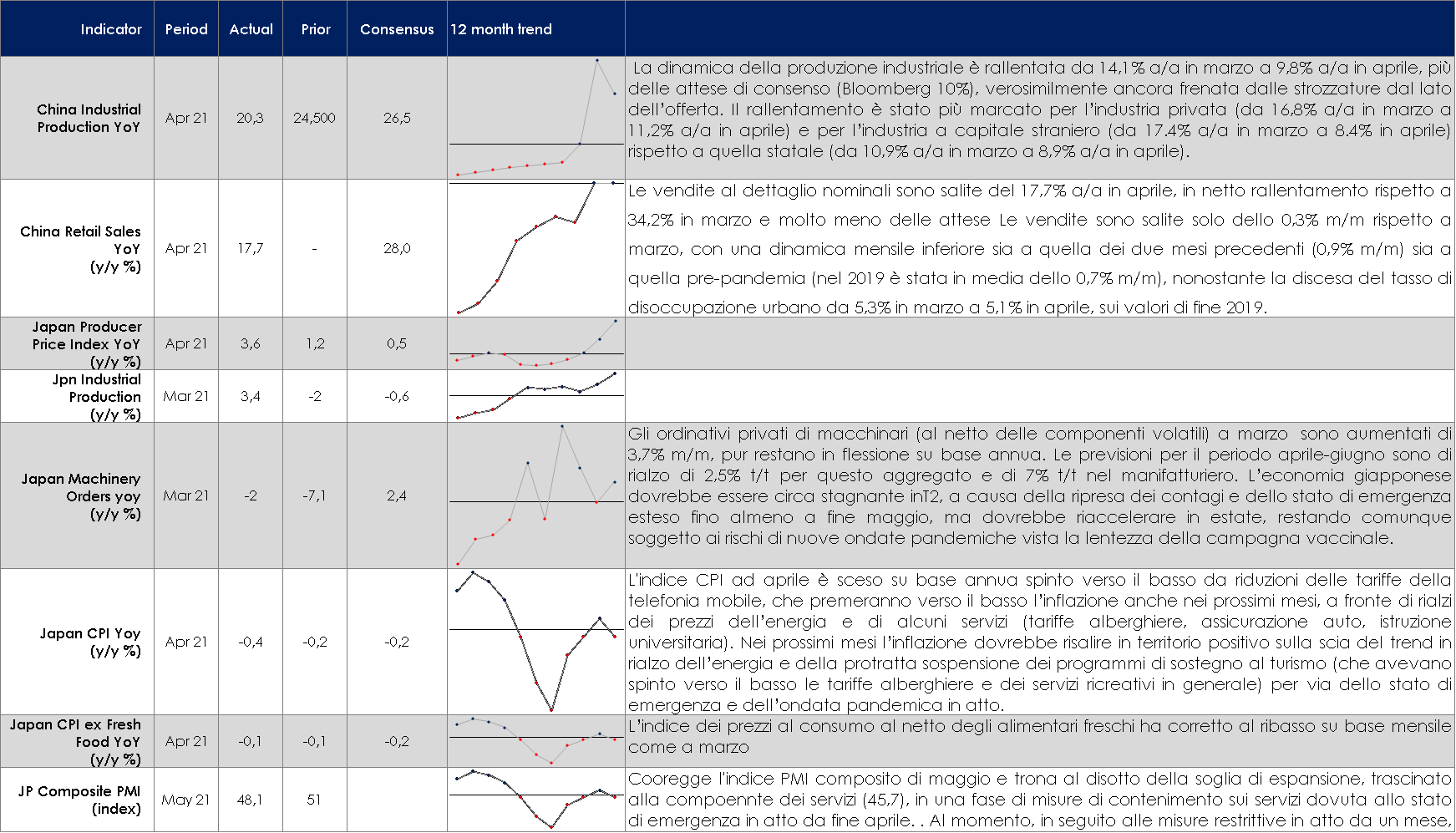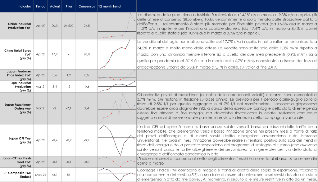 ASIA: il PIL giapponese si è contratto nuovamente in T1, mentre i dati cinesi di aprile segnalano una forte domanda esterna ma una domanda interna debole.