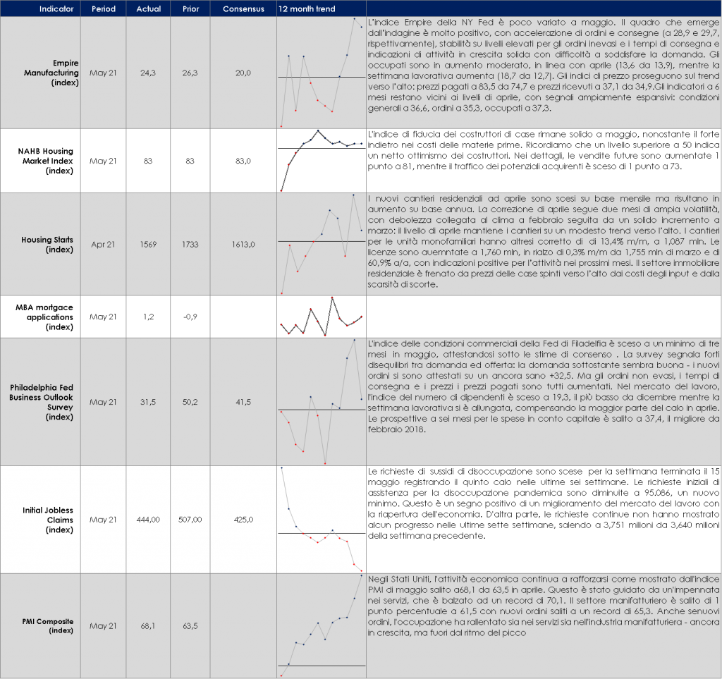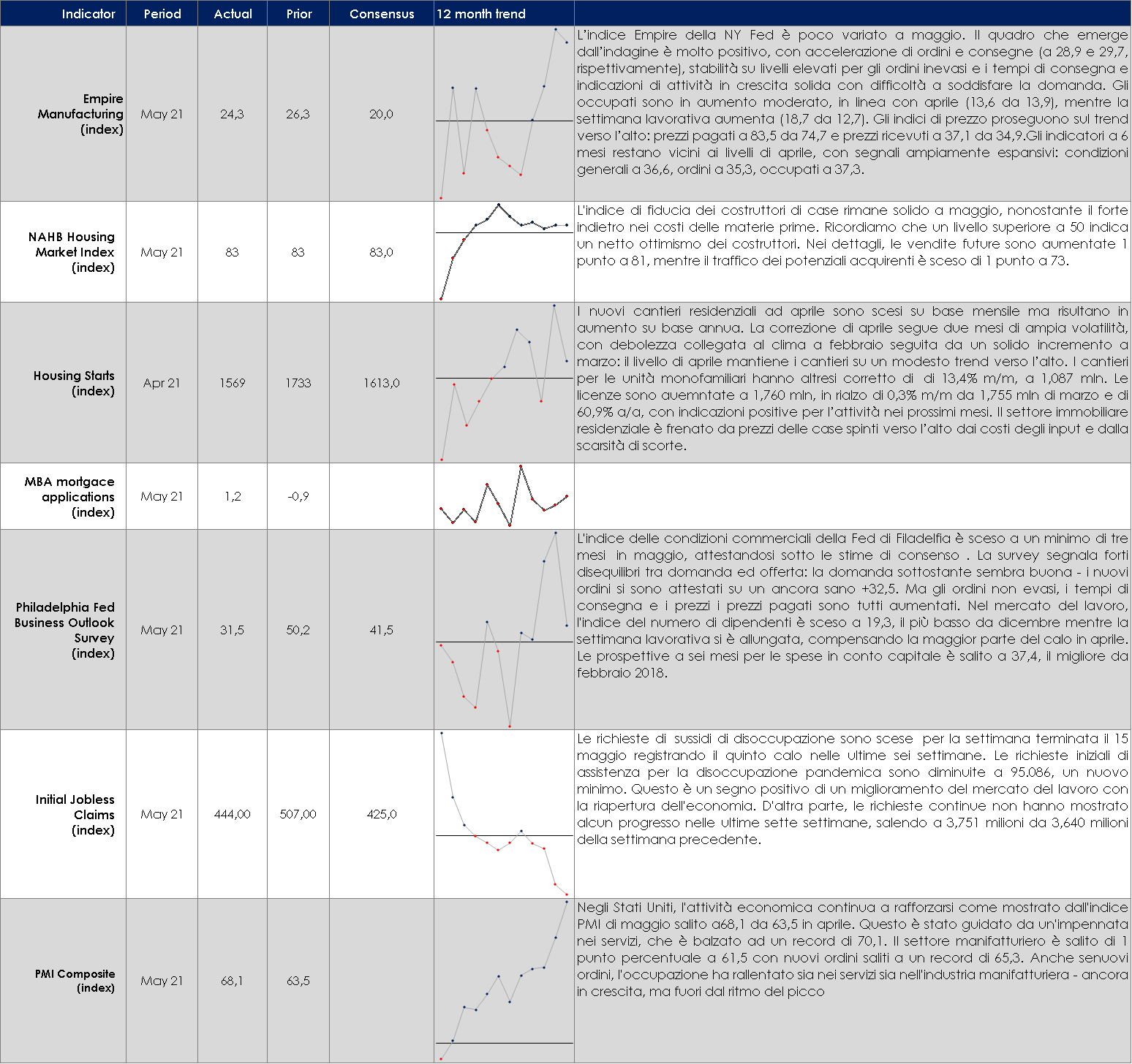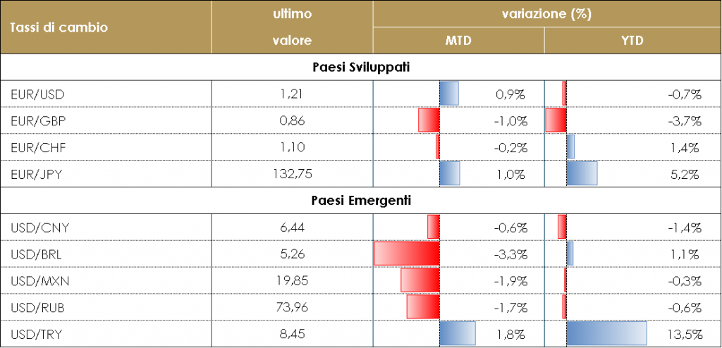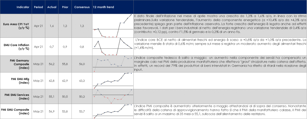 Anche alla luce dei recenti dati elevati sull’inflazione il mercato dei titoli governativi inizia a prezzare quanto meno una revisione degli stimoli monetari. I rendimenti del Treasury statunitense a 10 anni hanno chiuso la settimana in rialzo, ma ancora lontano dai recenti massimi fatti segnare a marzo, in area 1.80% Allo stesso tempo, i rendimenti europei sono aumentati guidati da un significativo sell-off dei tassi reali su tutta la curva.Sul fronte delle banche centrali e della discussione sulla futura normalizzazione della politica monetaria, questa settimana abbiamo assistito alla pubblicazione delle minute del meeting del FOMC di fine aprile, che non modificano in modo significativo la valutazione congiunturale, ma segnalano esplicitamente che si avvicina il momento per preparare la prima svolta della politica monetaria. La vera novità del documento appare nella parte relativa allo scenario, dove si afferma che “un numero di partecipanti ha suggerito che se l’economia continuerà a fare rapidi progressi verso gli obiettivi del FOMC, potrebbe essere appropriato a un certo punto nelle prossime riunioni cominciare a discutere un piano per aggiustare il ritmo degli acquisti di titoli”. Nel testo si ripete che “ci vorrà probabilmente un certo tempo prima che l’economia abbia fatto un ulteriore sostanziale progresso verso gli obiettivi”, e che il FOMC intende comunicare chiaramente la propria valutazione del progresso ben in anticipo rispetto a quando sarà giudicato “abbastanza sostanziale da giustificare un cambiamento del ritmo degli acquisti”. Nell’Area Euro, la comunicazione della BCE sembra essere rivolta a sottolineare il diverso contesto economico e la sua non preoccupazione per i dati di inflazione. Il capo economista della BCE, Philip Lane, facendo eco a quanto detto la settimana scorsa dal membro del consiglio esecutivo, Fabio Panetta, ha chiaramente minimizzato il rischio di l’inflazione affermando che: semplicemente non vede l’evidenza che“ il mondo e l’Area Euro abbiano una sorta di ambiente predisposto ad un’inflazione persistente “, aggiungendo che: “C’è una connessione quasi nulla tra qualsiasi tipo di picco dei prezzi e la riapertura dell’economia mondiale, e ciò che va nella tendenza dell’inflazione”.