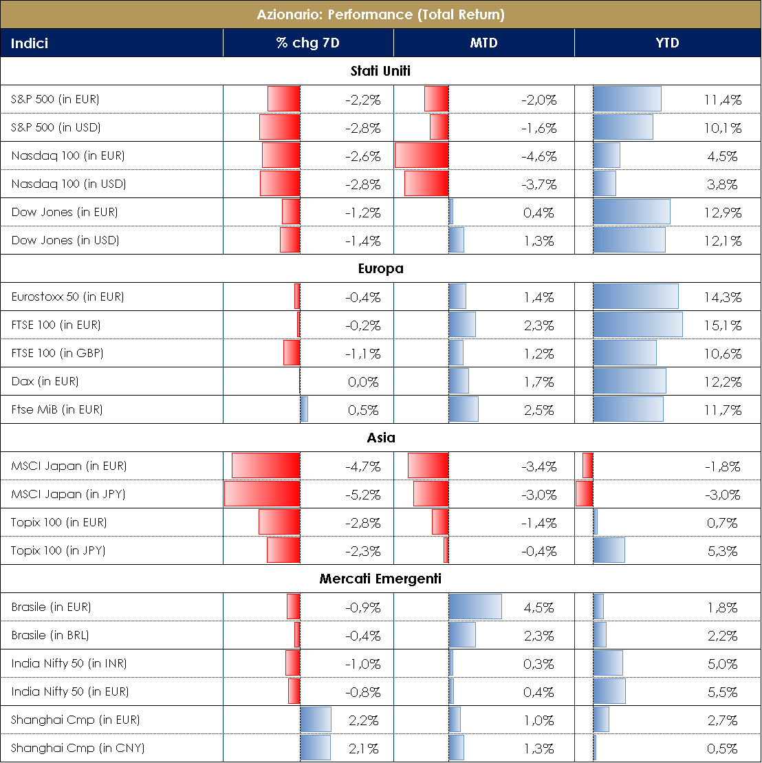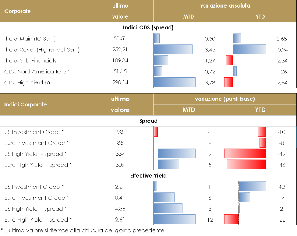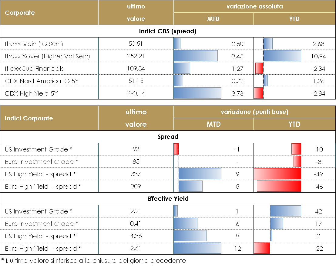 Nell’ultima settimana il mercato corporate ha avuto una performance marginalmente negativa guidata soprattutto dalla direzionalità dei tassi sia in Europa che negli Stati Uniti con il comparto cash che tende a sottoperformare nel periodo data la pressione del mercato primario, particolarmente attivo sia su finanziari che corporate, IG e HY. Spread in lieve allargamento con una fase di maggiore debolezza nella prima parte della settimana e un buon recupero nelle ultime due sedute in chiusura.