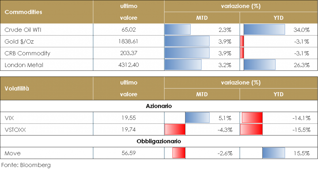 Cala il prezzo del petrolio ai minimi delle ultime tre settimane in scia all’aumento dei casi di contagio in Asia e alla possibilità di un incremento dell’offerta sul mercato derivante dalla produzione iraniana. Resta alta l’attenzione per l’evoluzione della nuova emergenza sanitaria in India, terzo paese importatore di petrolio al mondo che potrebbe ridurre le attività produttive e quindi contrarre la domanda. Aumentano inoltre i segnali positivi derivanti dai colloqui tra Stati Uniti e Iran riguardo al nucleare; un accordo potrebbe portare a un incremento della produzione di petrolio. Deboli anche i prezzi dei metalli industriali e delle materie prime agricole, che nelle scorse settimane avevano alimentato la performance positiva dell’indice aggregato delle commodity.