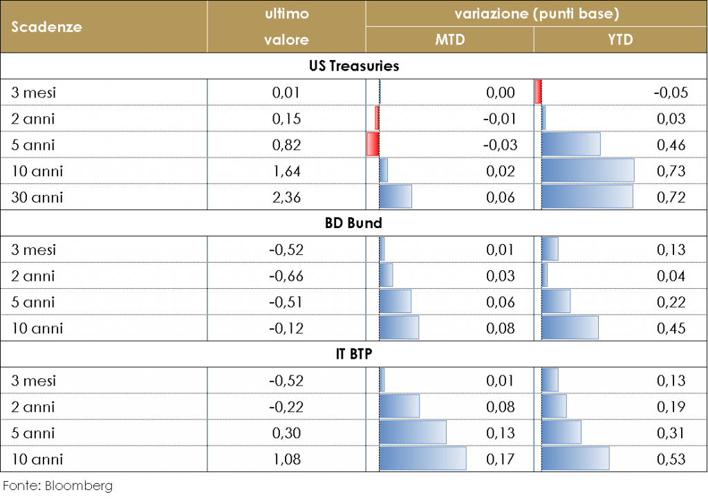 Governativo US: I rendimenti dei Treasury US hanno mostrato una modesta tendenza al rialzo, sulla scia della rimodulazione delle attese di crescita economica e dell’aumentato stimolo fiscale. La normalizzazione economica dovrebbe esercitare una certa pressione sui tassi a lunga, che tuttavia registreranno solo aumenti modesti, perché manipolati dalla Fed. Esprimiamo una view neutrale.